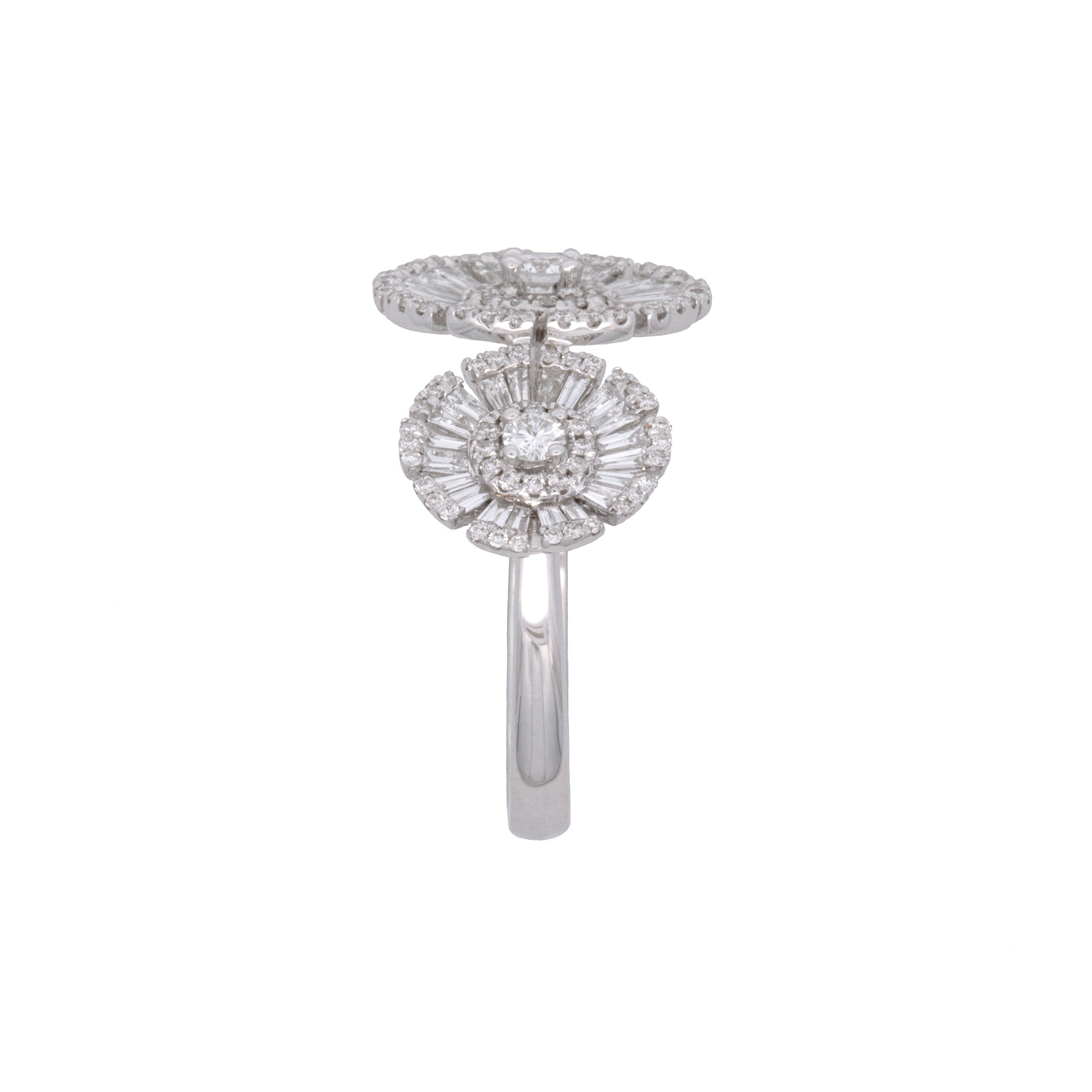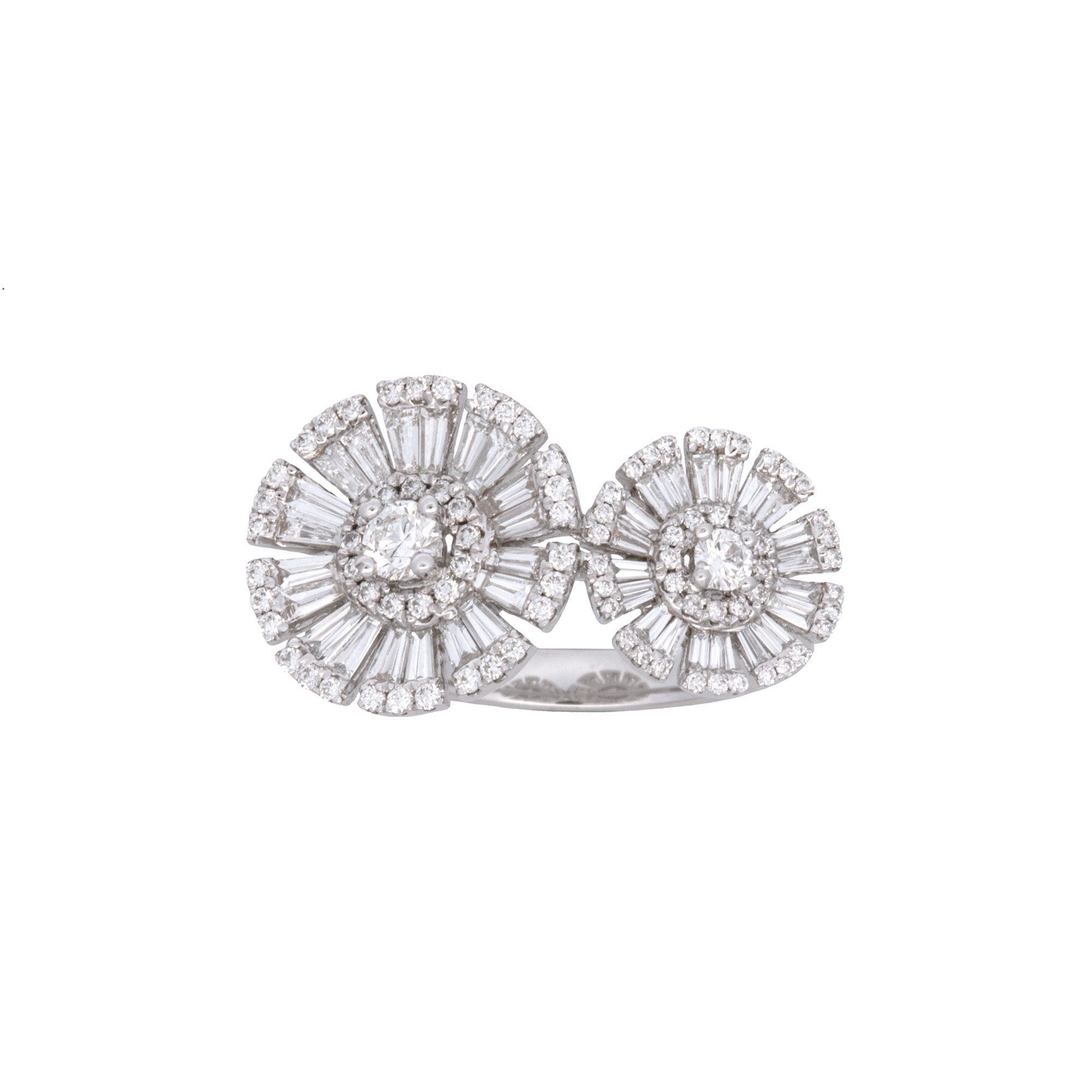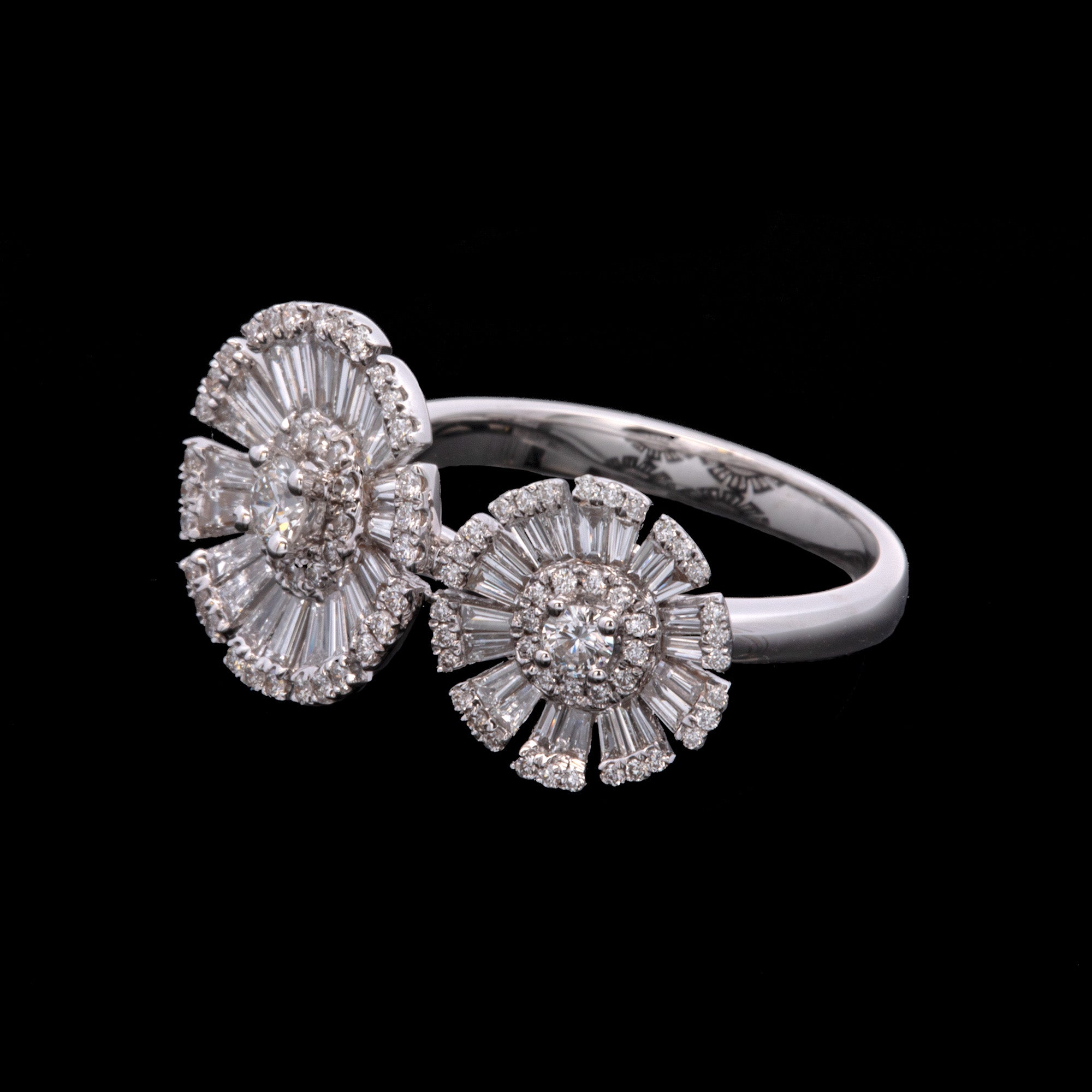 18K White Gold Double Flower Ring With Round and Baguette Diamonds