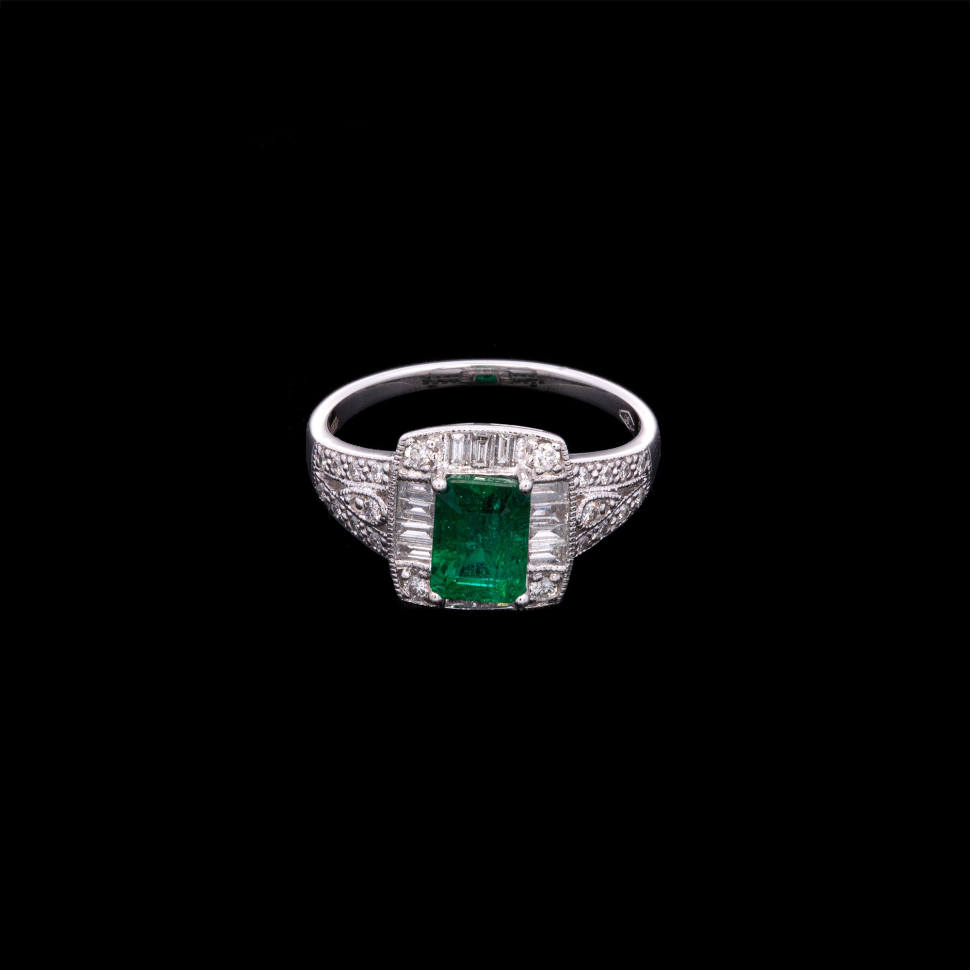 18K White Gold Emerald And Diamond Ring. Emerald Weighs 1.16 Carats. Thirty-Six Round And Baguette Diamonds Weigh A Total Of 0.52 Carats. Sizing Available.