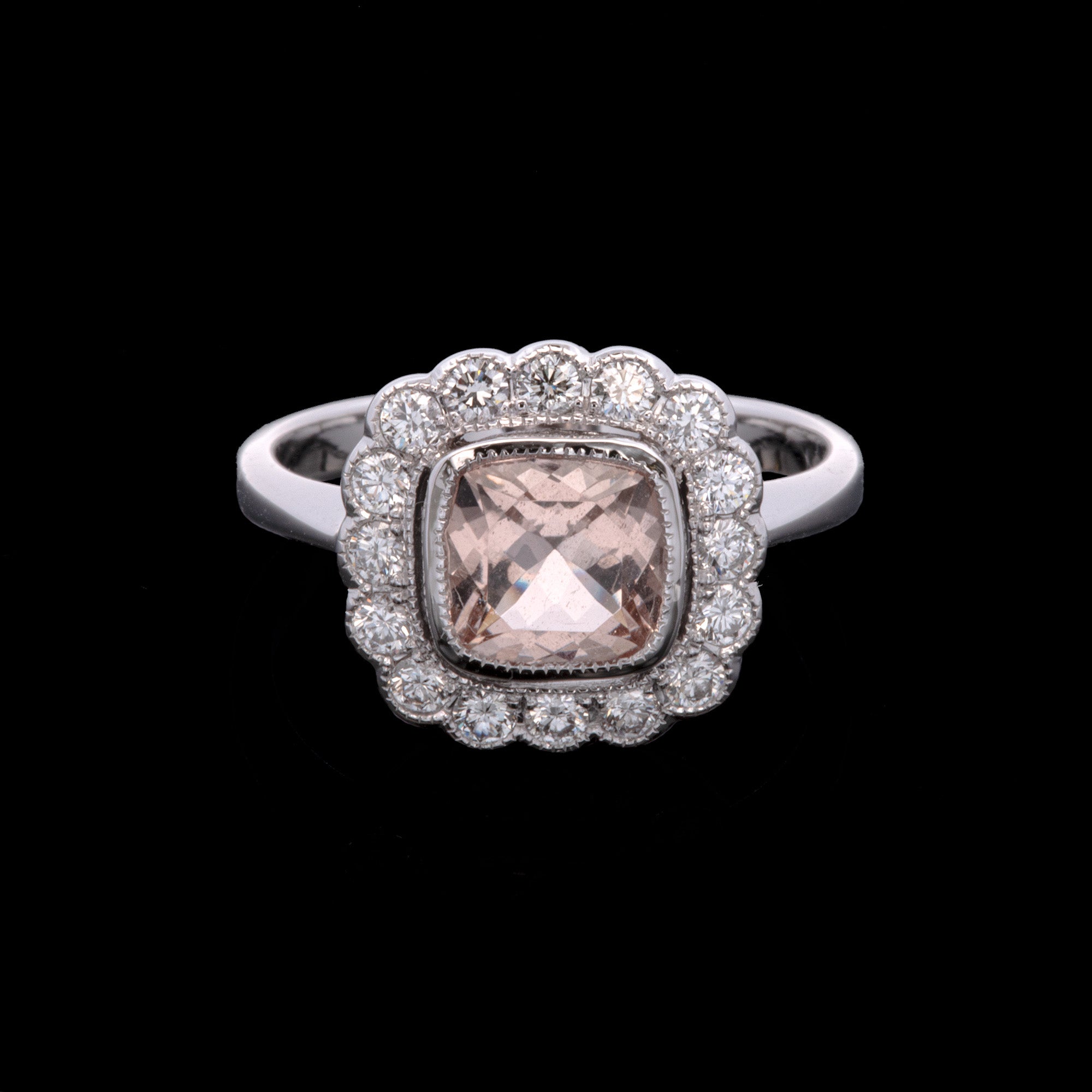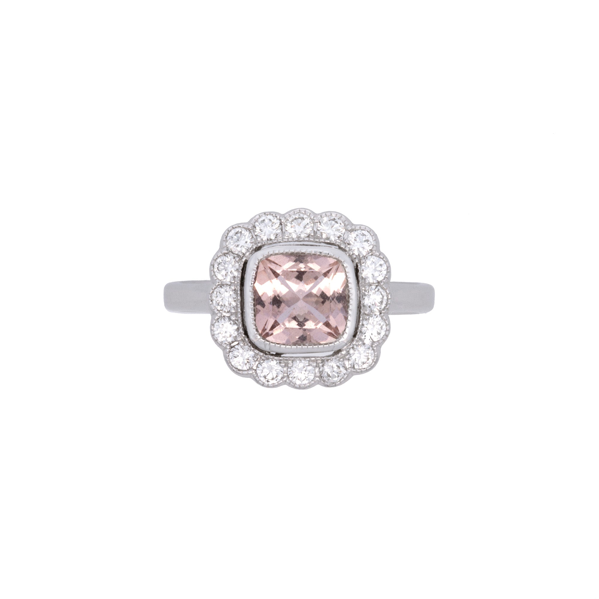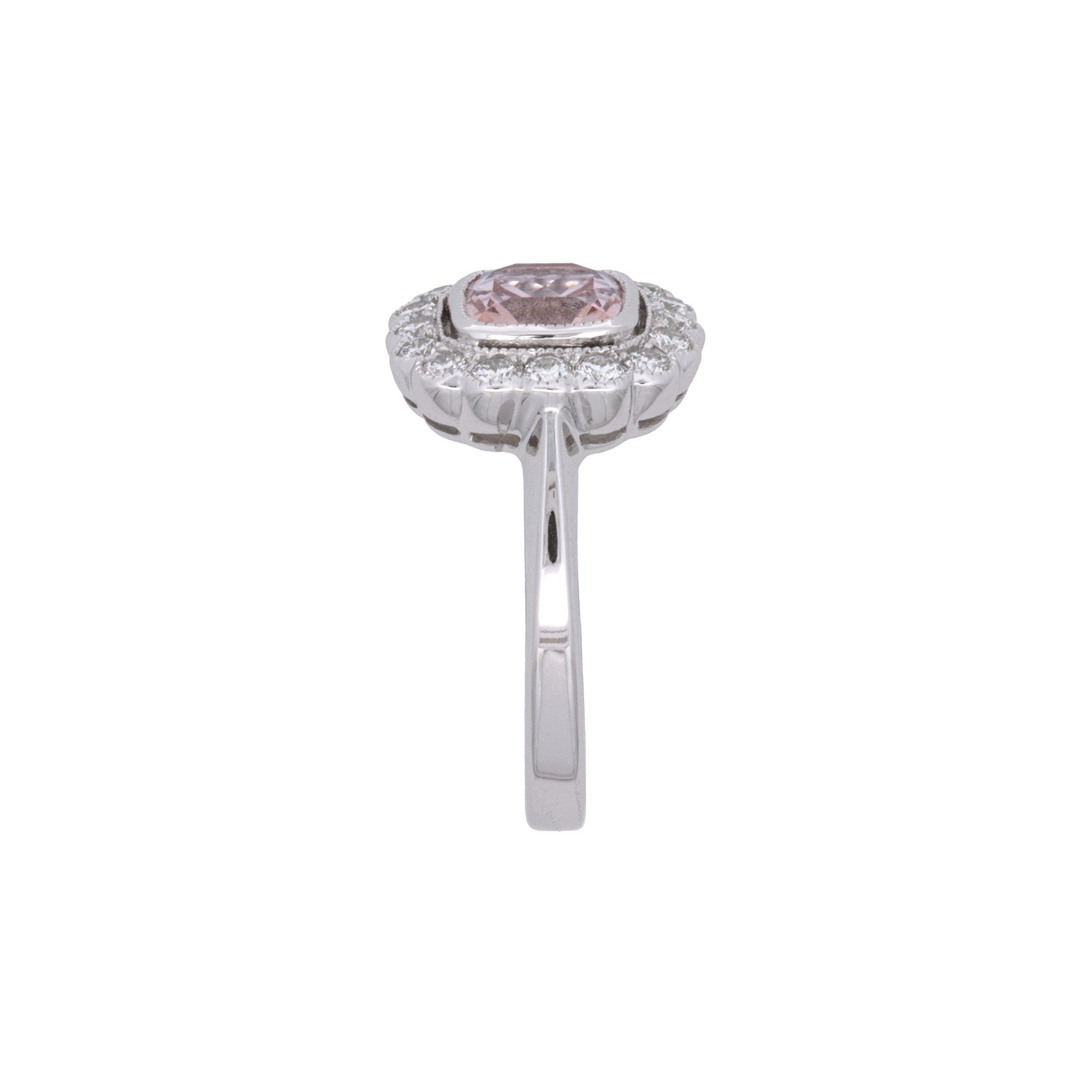 18K White Gold Morganite And Diamond Halo Ring. Morganite Weighs 1.20 Carats. Diamonds Weigh a Total Of 0.48 Carats. Sizing Available.