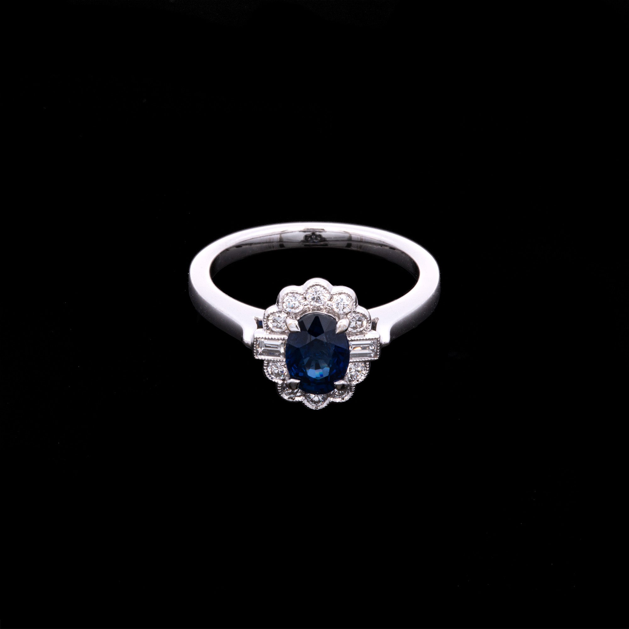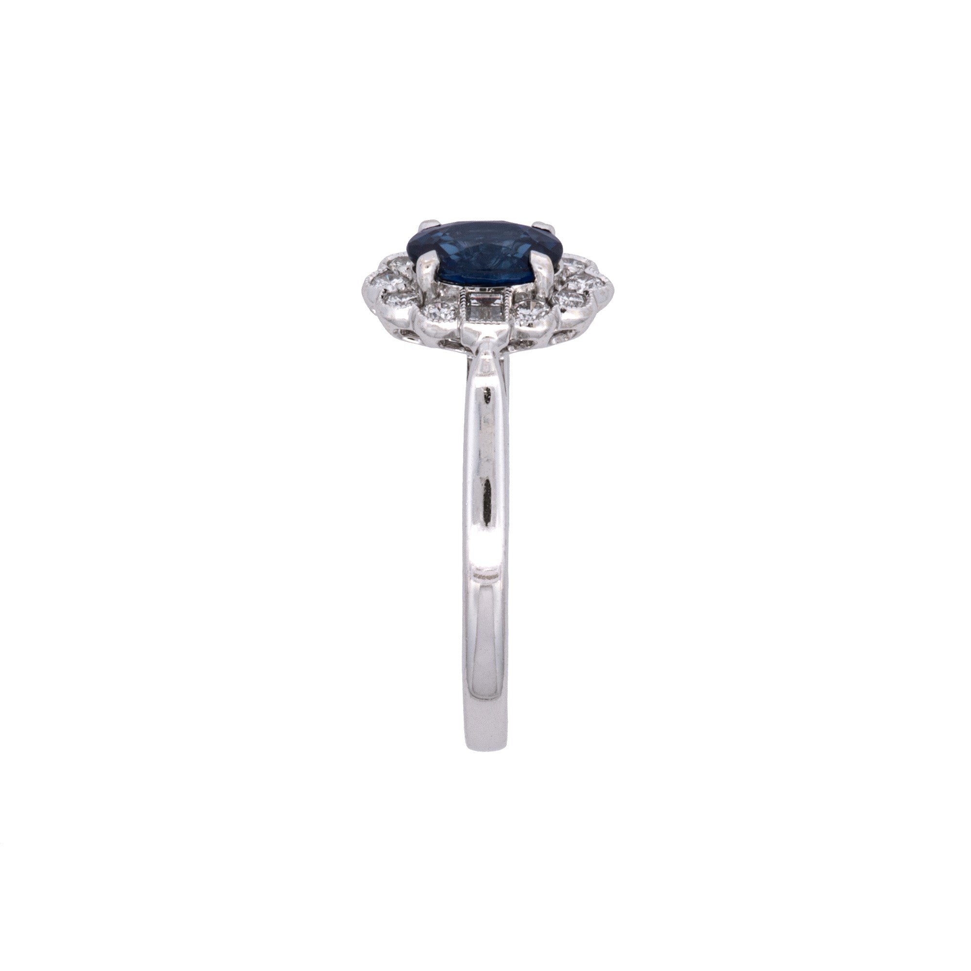 18K White Gold Oval Sapphire And Diamond Ring. Sapphire Weighs A Total Of 1.08 Carats. Ten Diamonds Weigh A Total Of 0.36 Carats. Sizing Available.