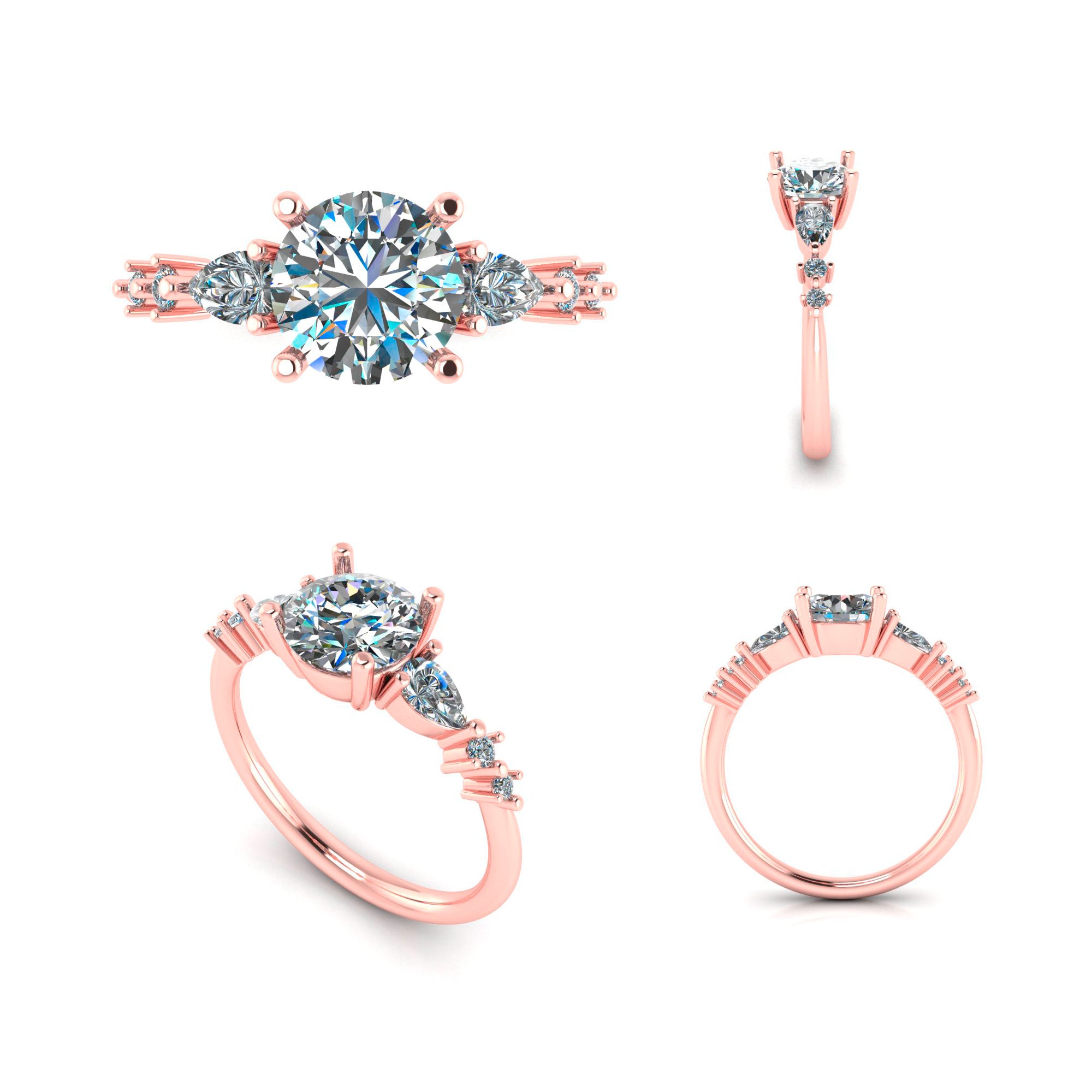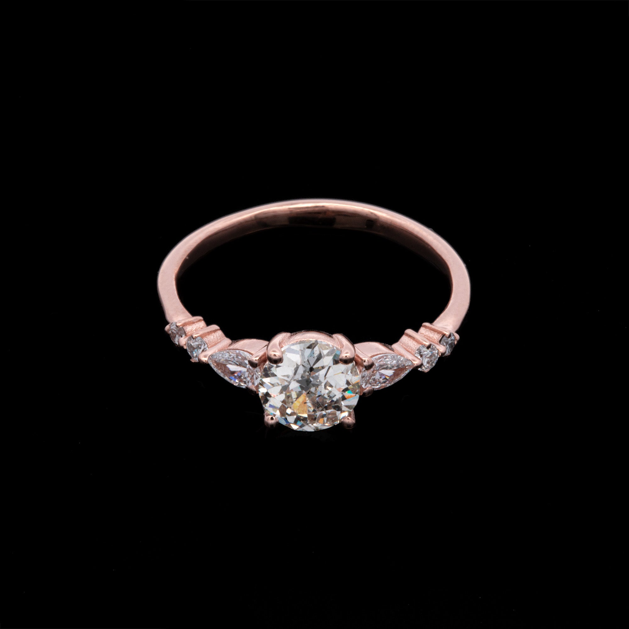 Custom 14K Rose Gold Old Mine Cut Diamond Ring With Pear Shape And Round Brilliant Cut Diamond Accents. Center Diamond Weighs 0.94 Carats. Accent Diamonds Weigh A total Of 0.24 Carats.