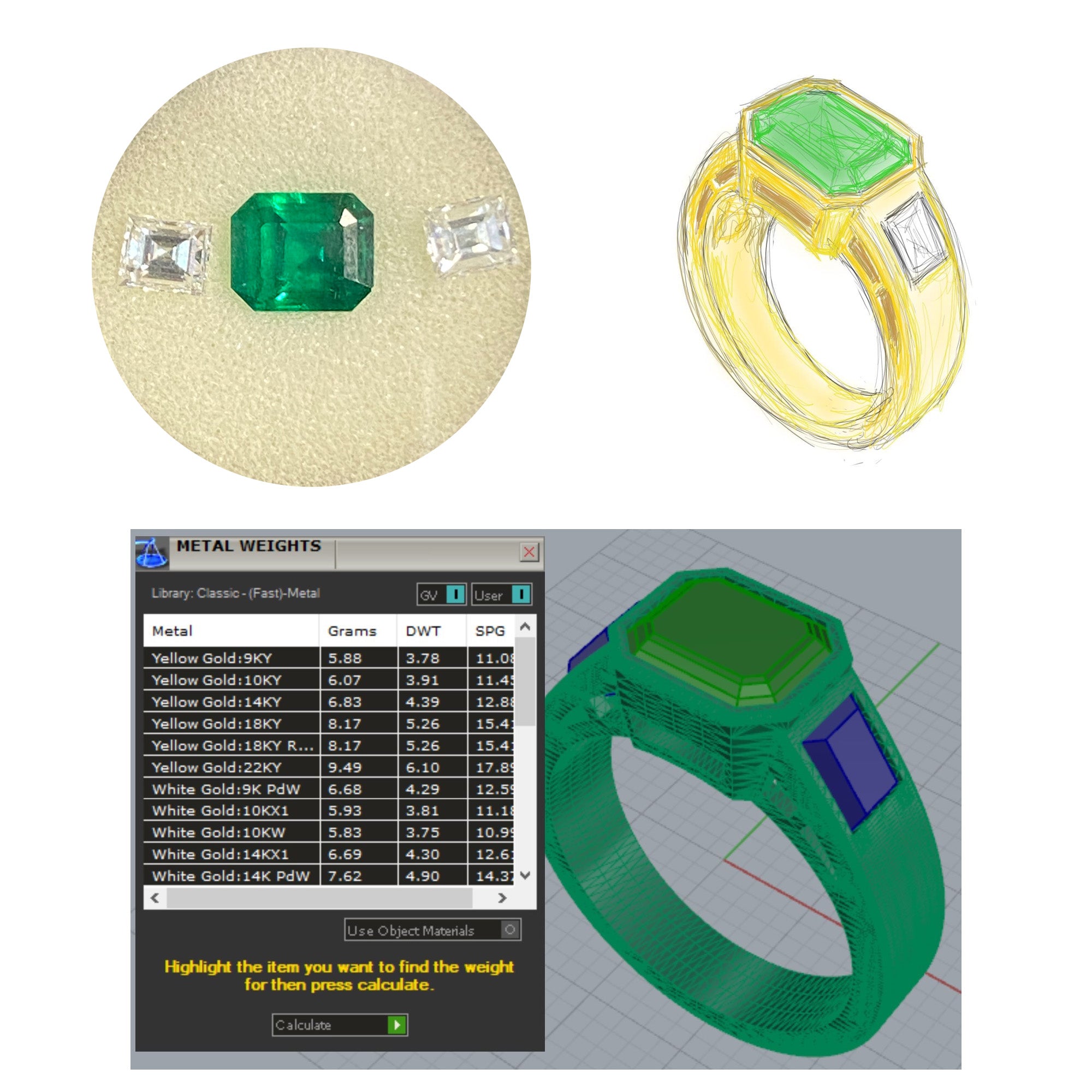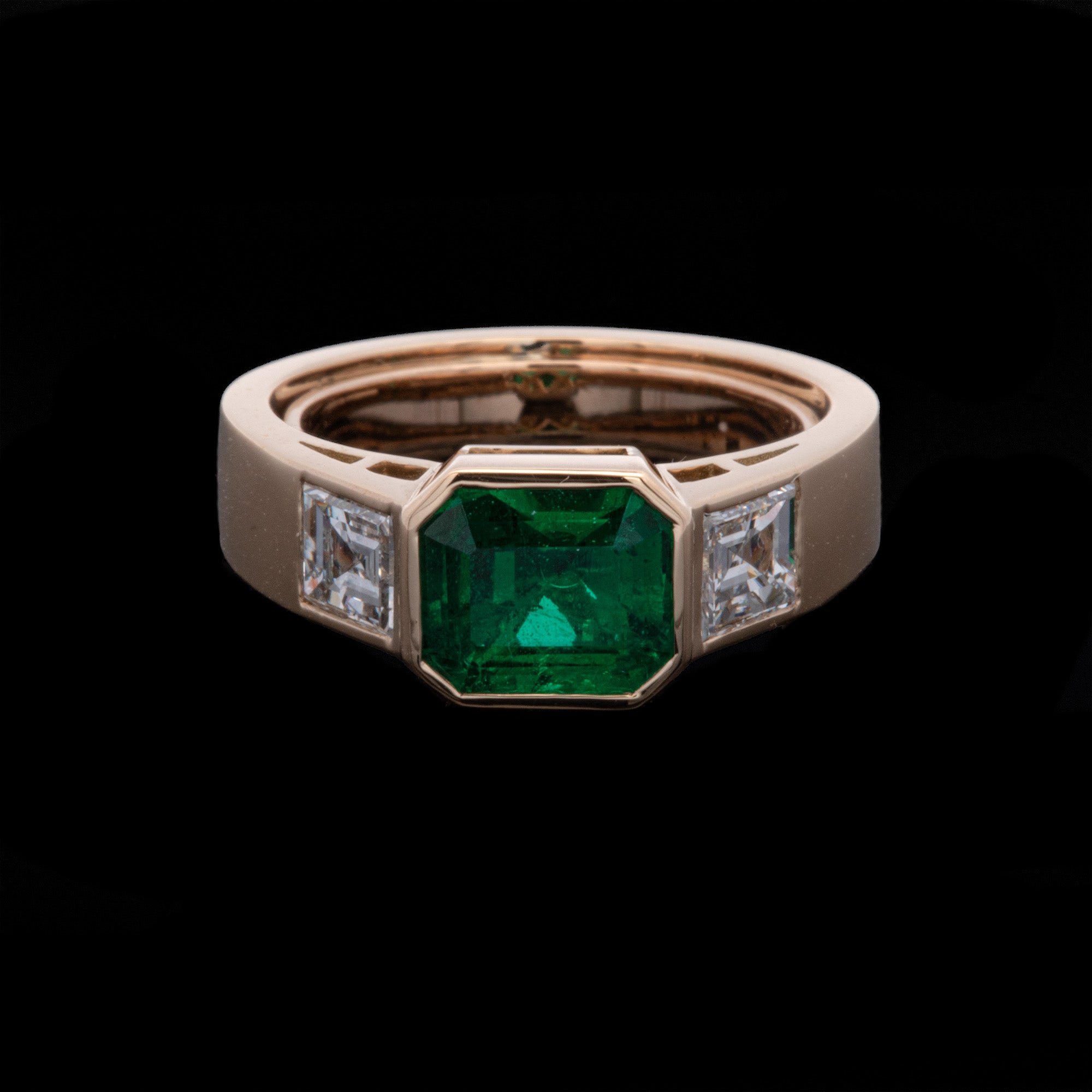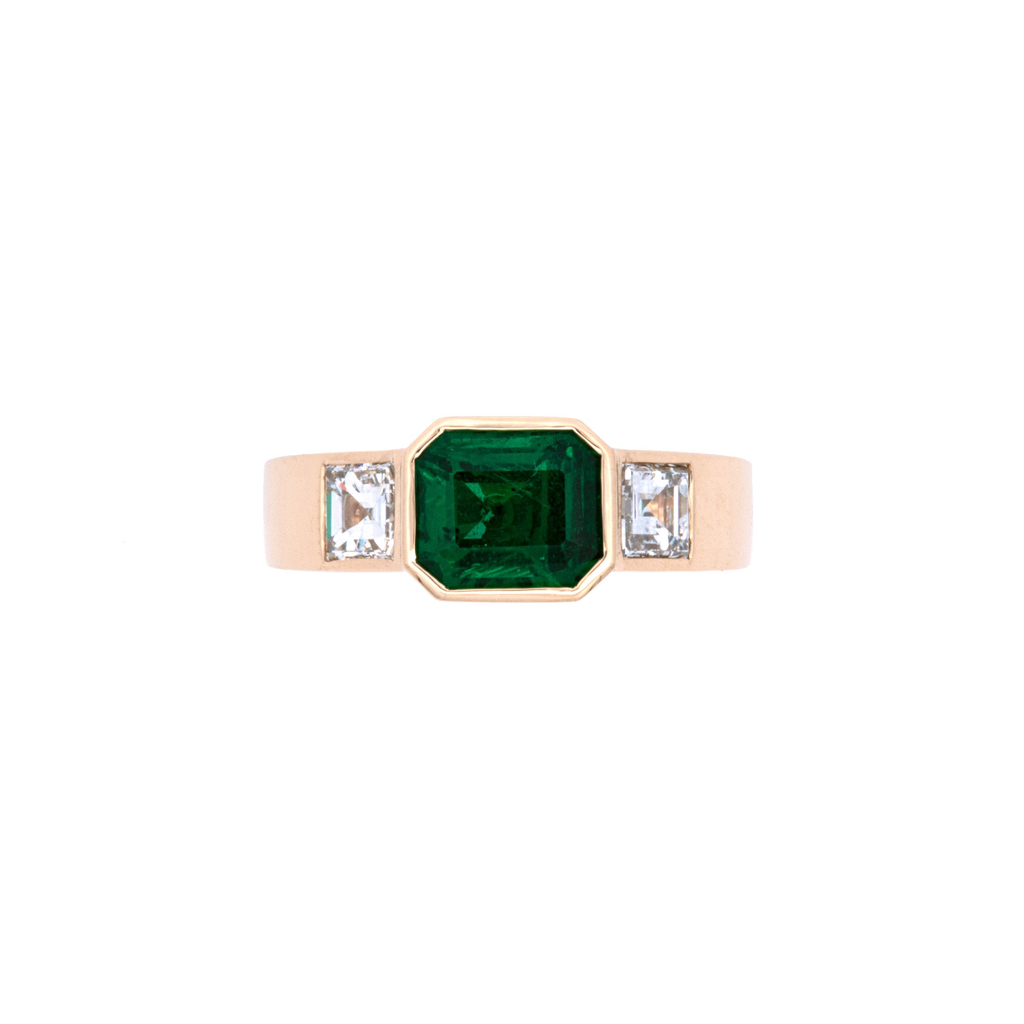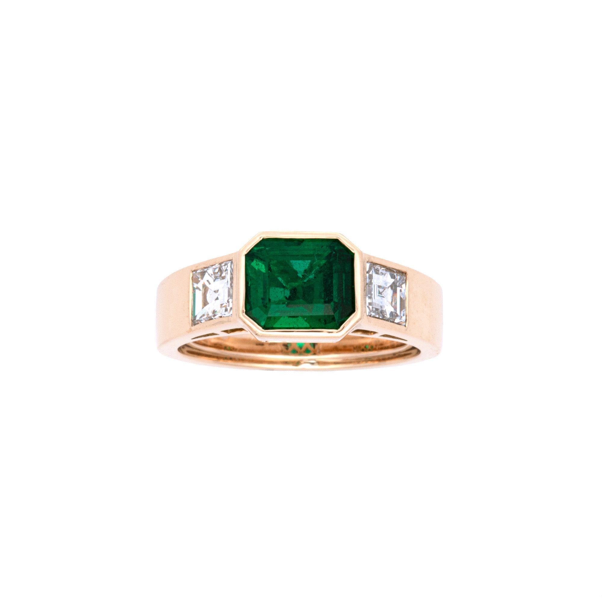 Custom 18K Yellow Gold Bezel Set Emerald Cut Emerald And Emerald Cut Diamond Ring. Emerald Weighs 1.75 Carats. Diamonds Weigh A Total Of 0.98 Carats And Have F Color, VS1 Clarity.