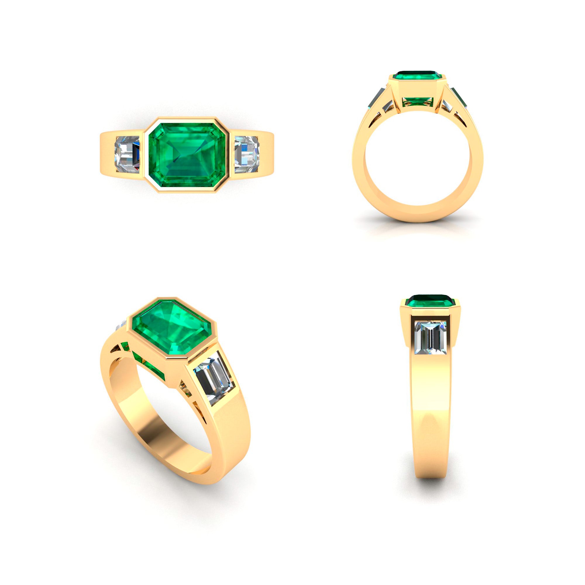 Custom 18K Yellow Gold Bezel Set Emerald Cut Emerald And Emerald Cut Diamond Ring