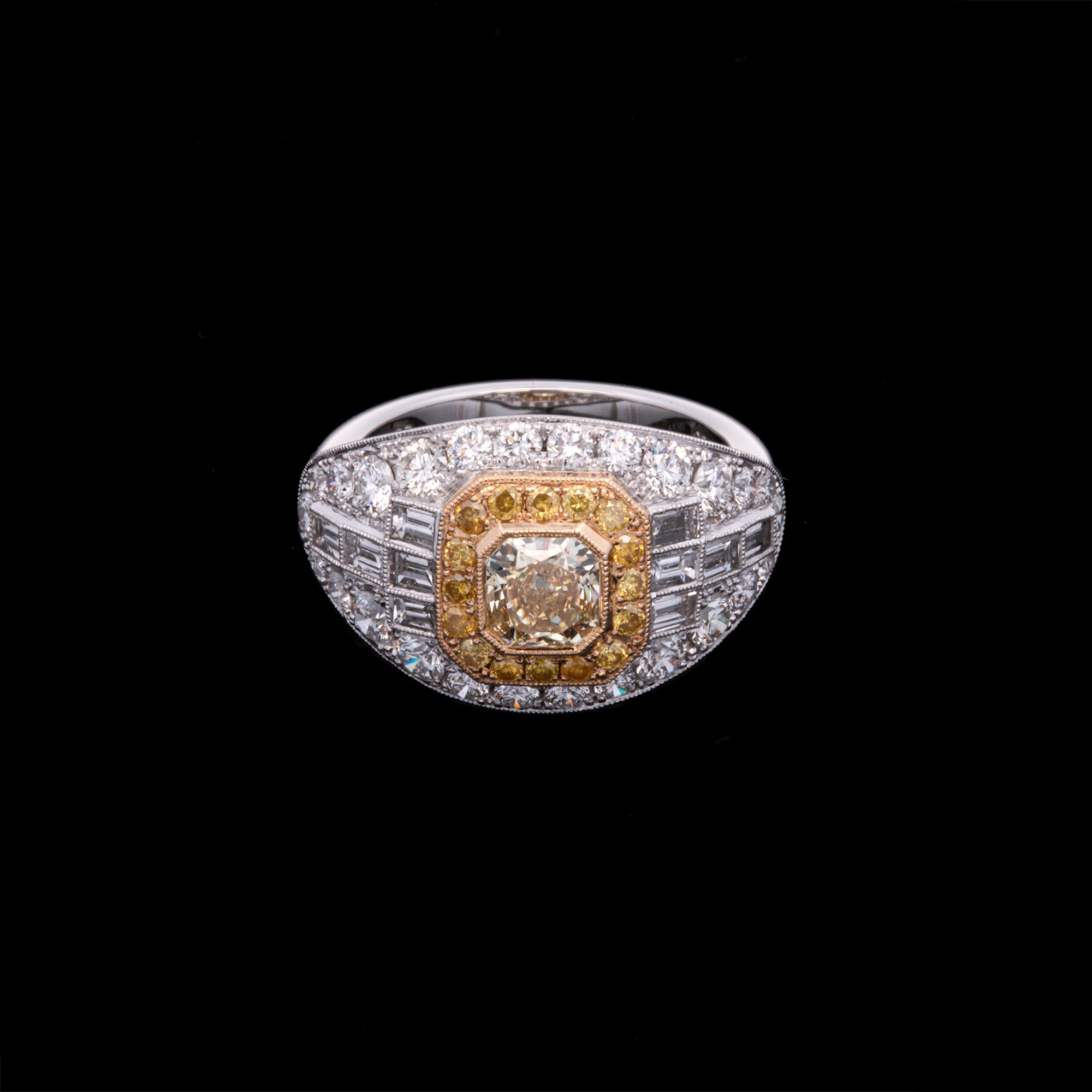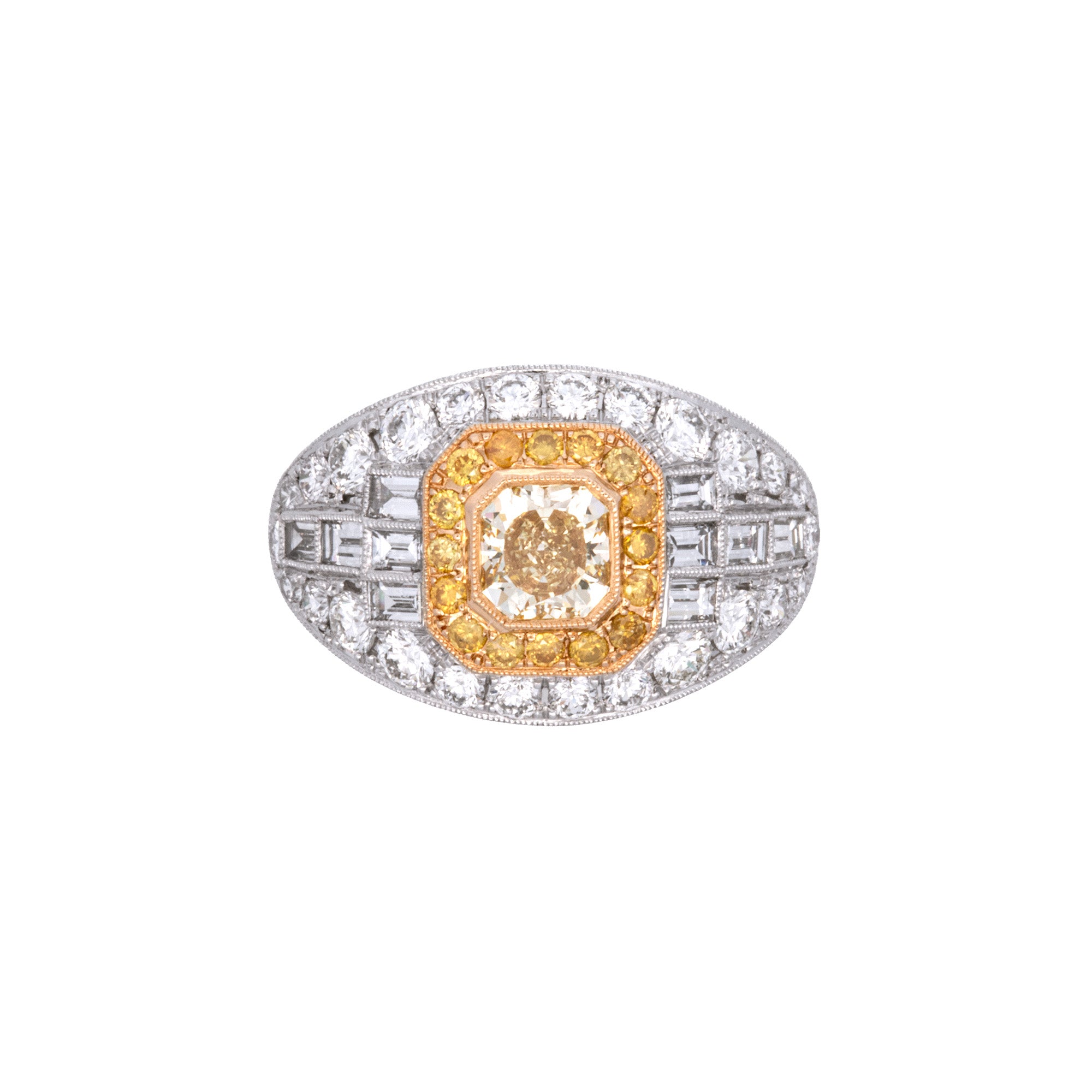 Platinum and 18K Yellow Gold Radiant Cut Diamond Ring With Yellow And White Diamond Accents
