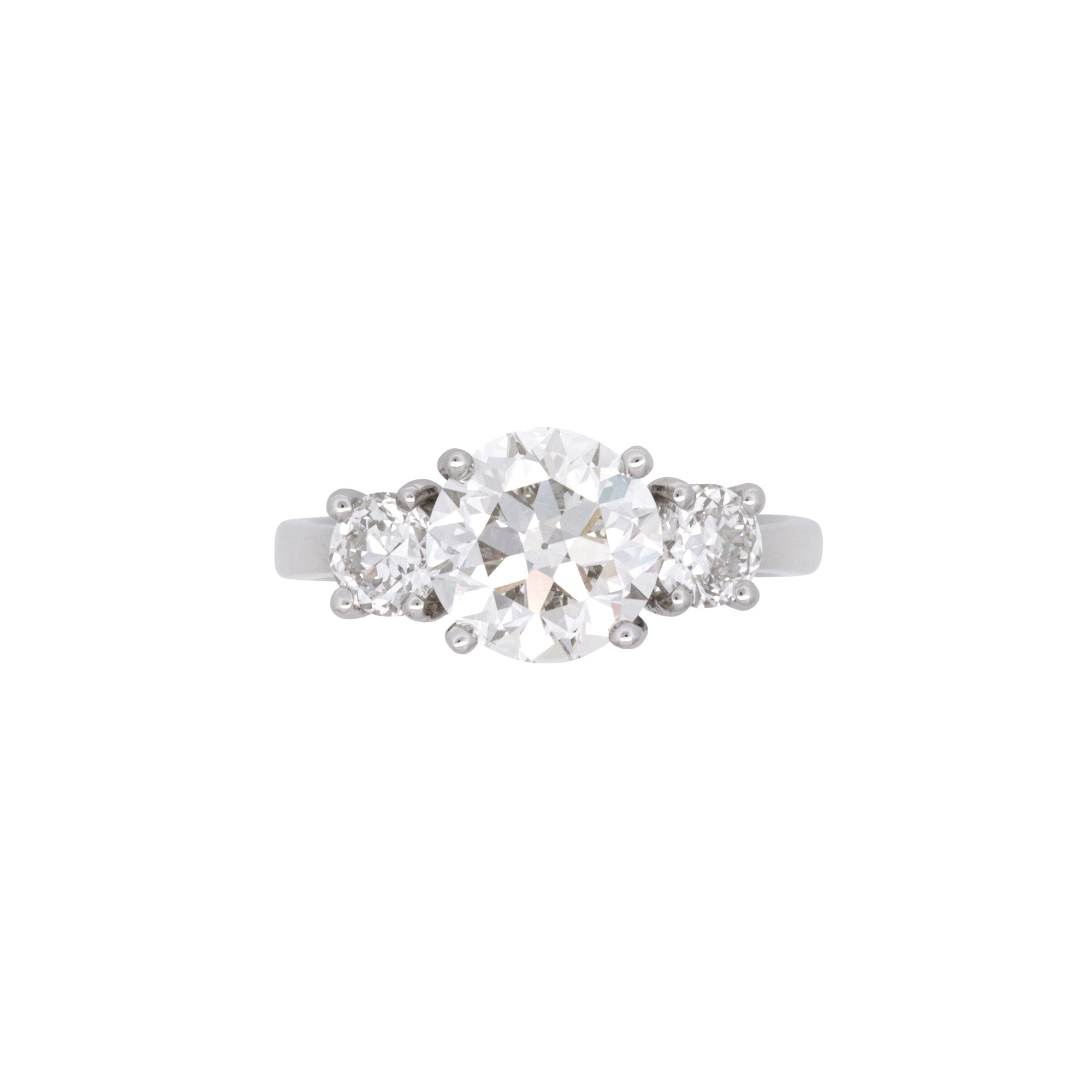 Platinum Old European Cut Diamond Three Stone Engagement Ring. Center Diamond Weighs 2.85 Carats And Has J Color, VS1 Clarity; GIA Certified. Accent Diamond Weigh A Total Of 0.85 Carats. Sizing Available.