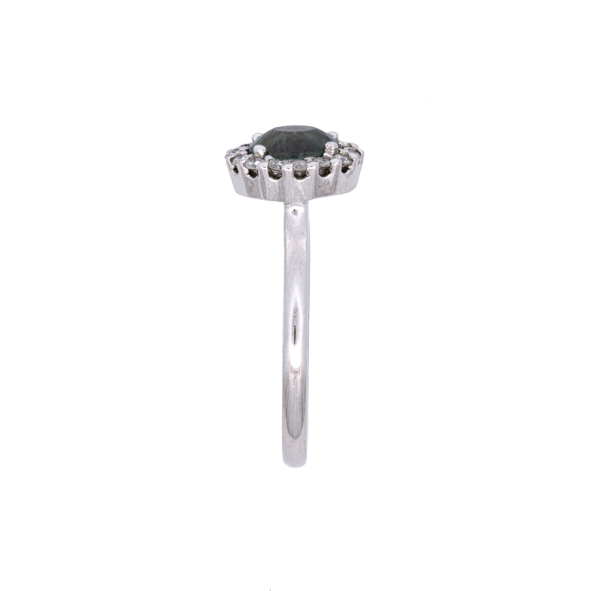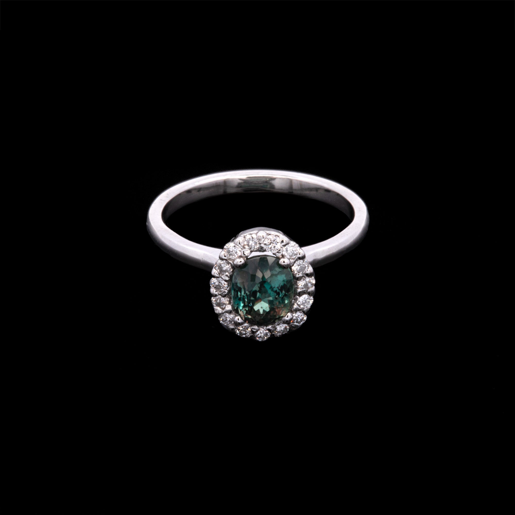 Platinum Oval Alexandrite And Diamond Halo Ring. Alexandrite Weighs 1.36 Carats. Diamonds Weigh A Total Of 0.25 Carats. Sizing Available.