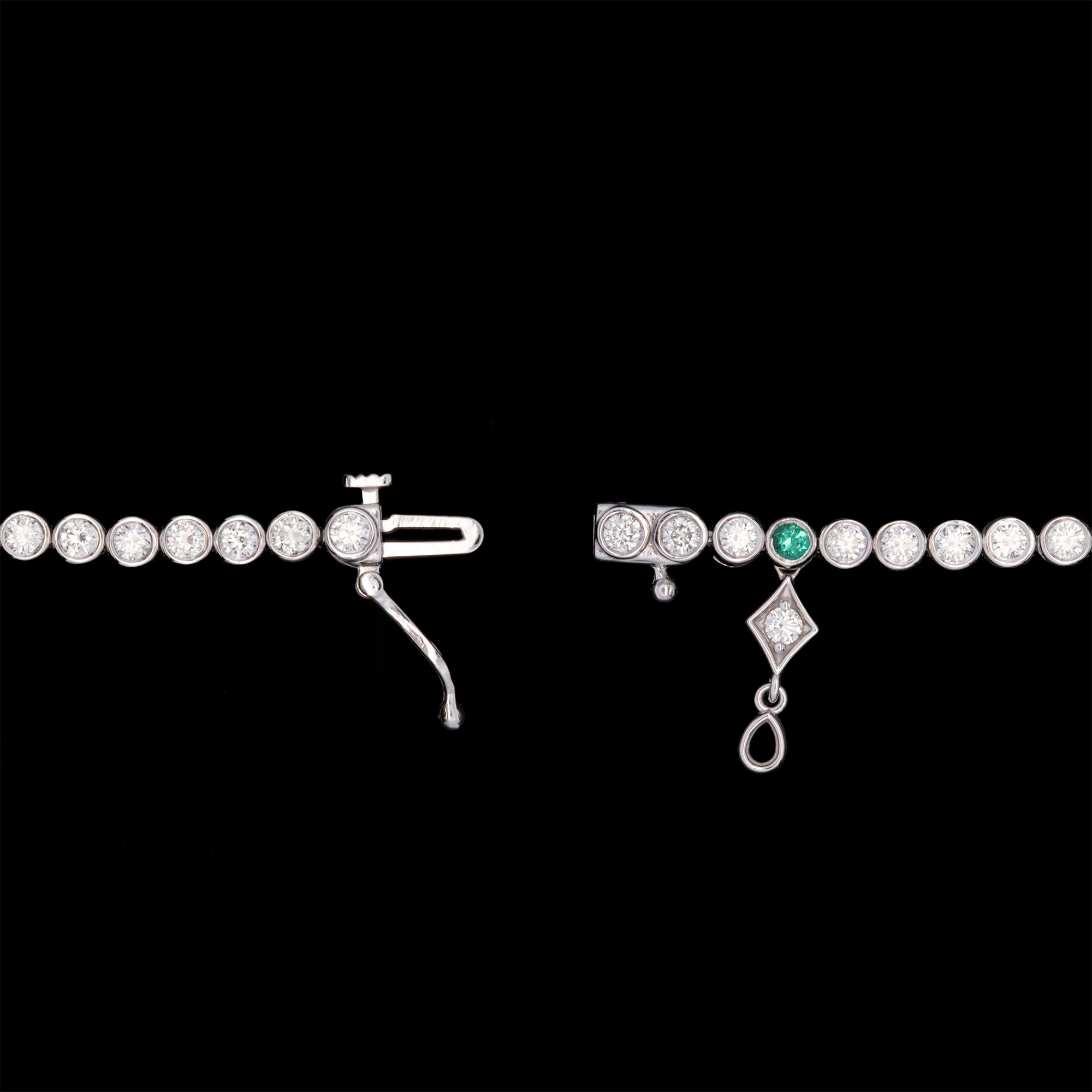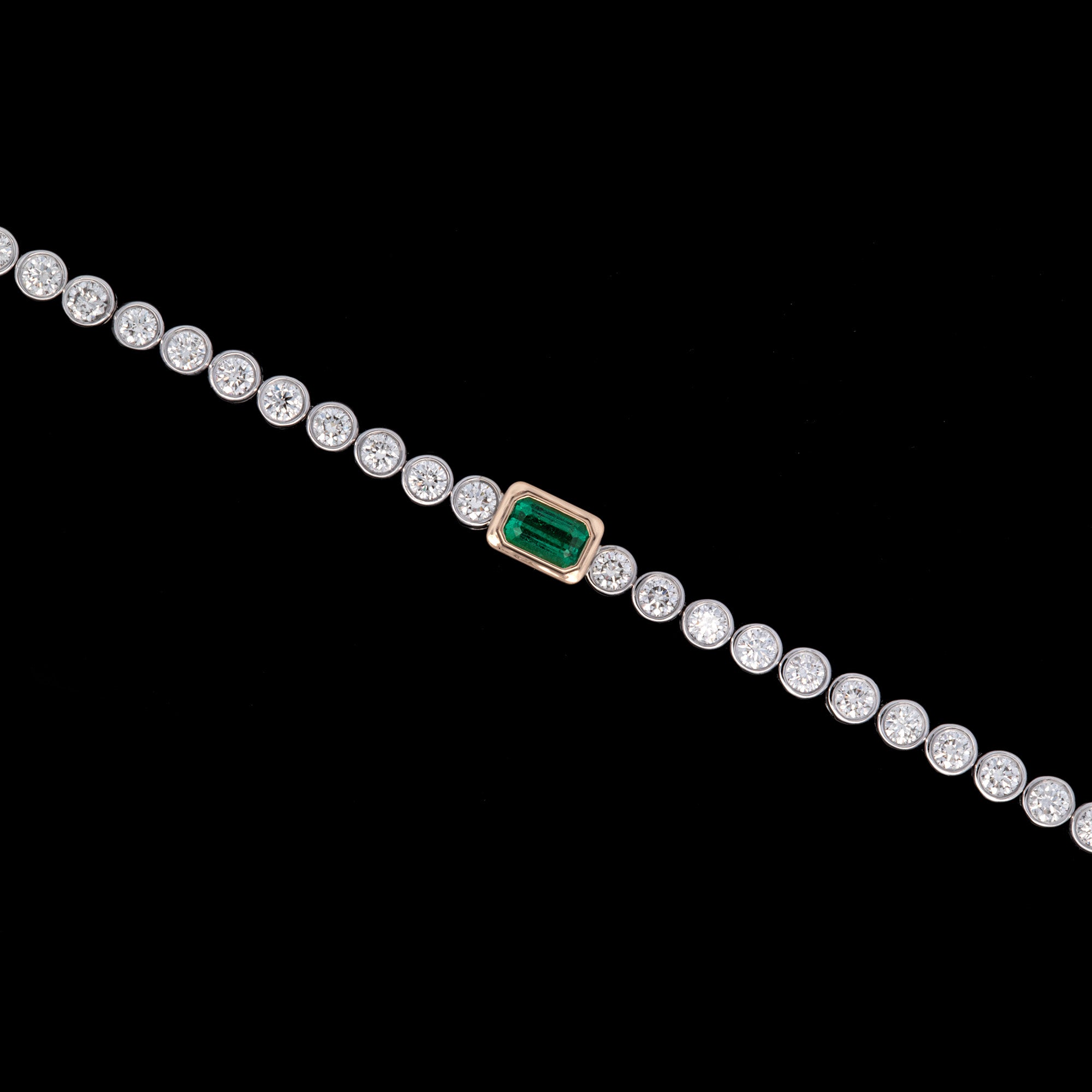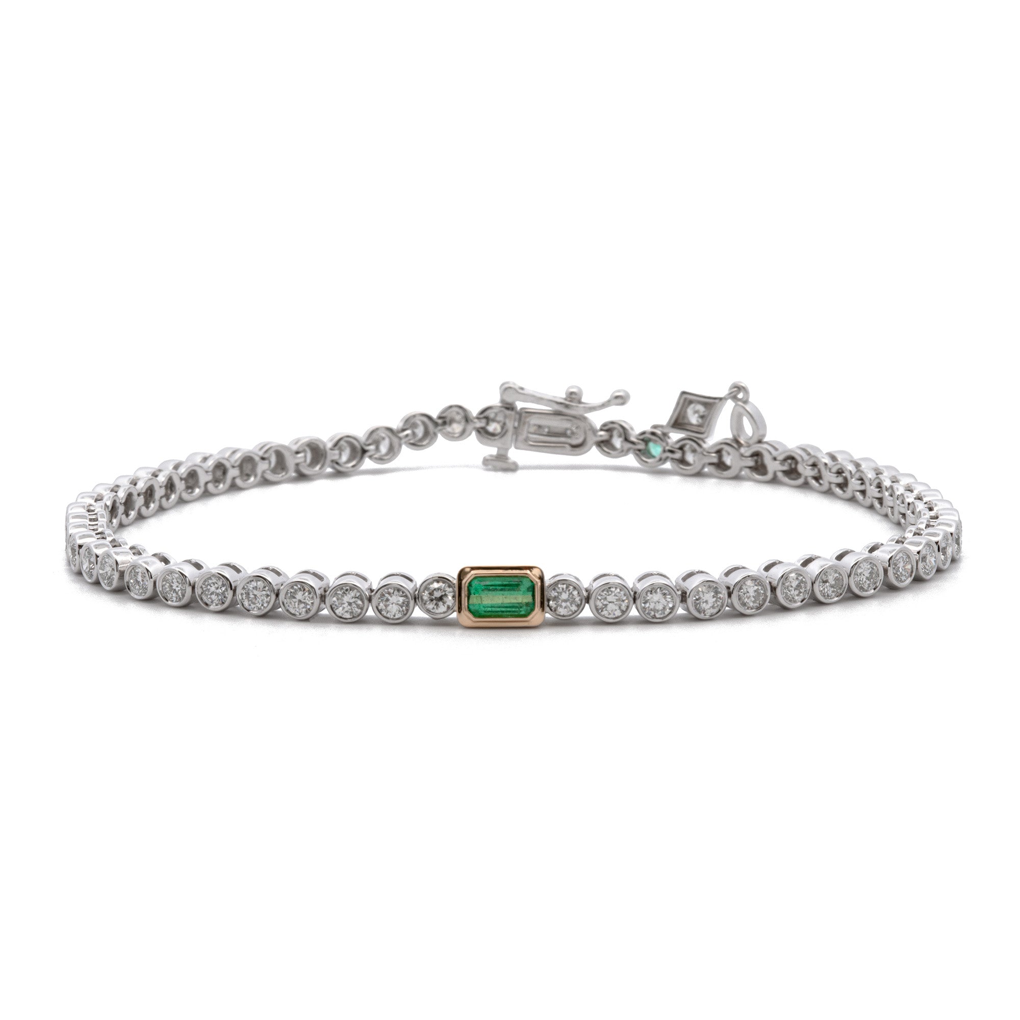 Custom 18K White And Yellow Gold Bezel Set Emerald And Diamond Line Bracelet, 7.25 Inches