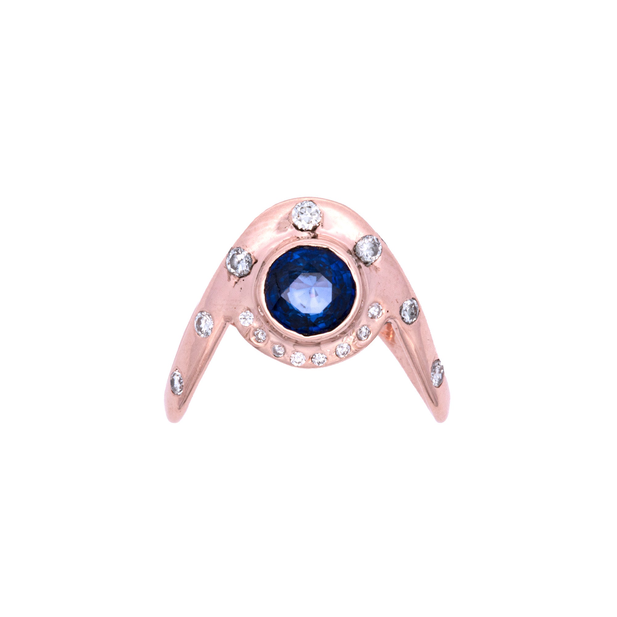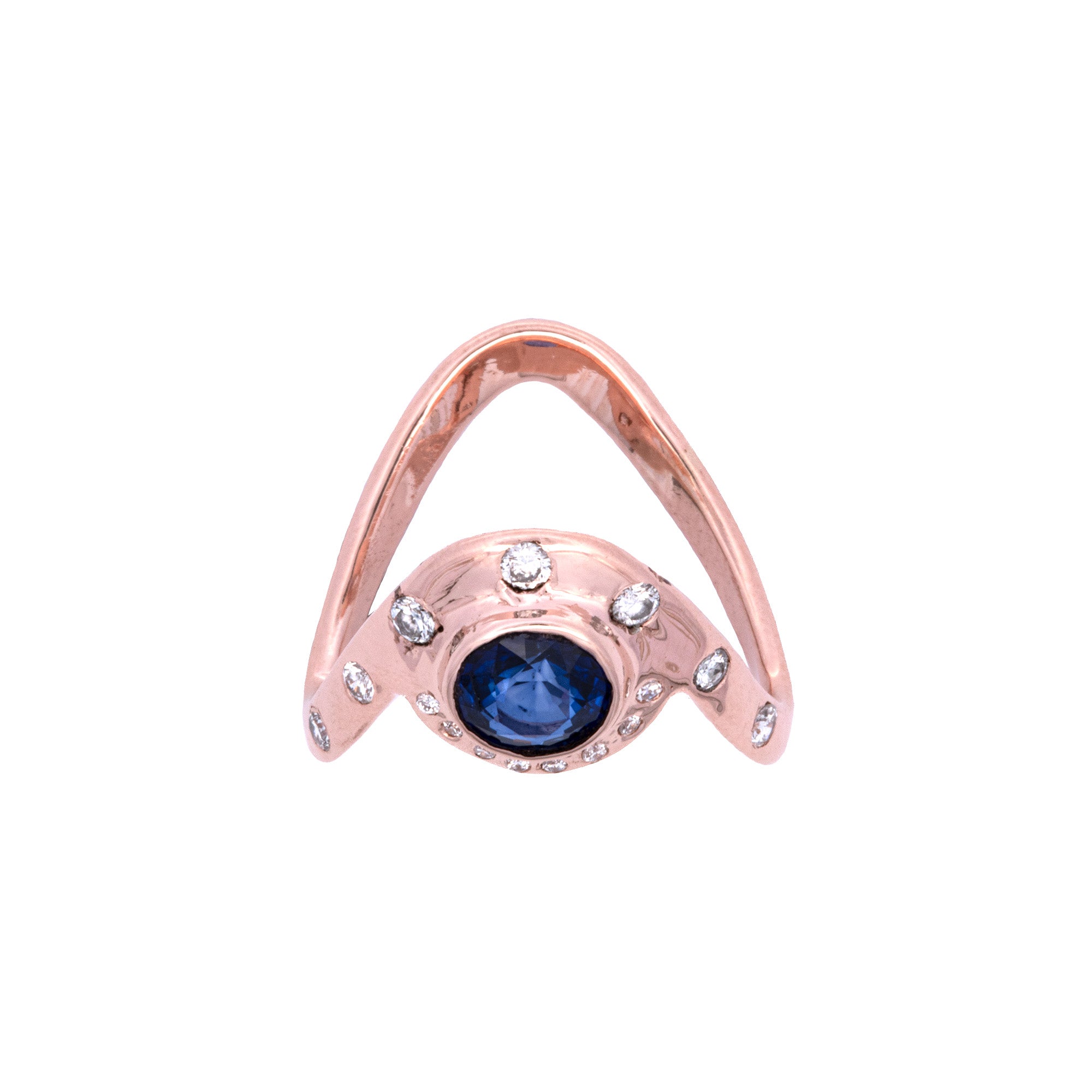 Custom 14K Rose Gold Round Blue Sapphire And Diamond Slalom Ring