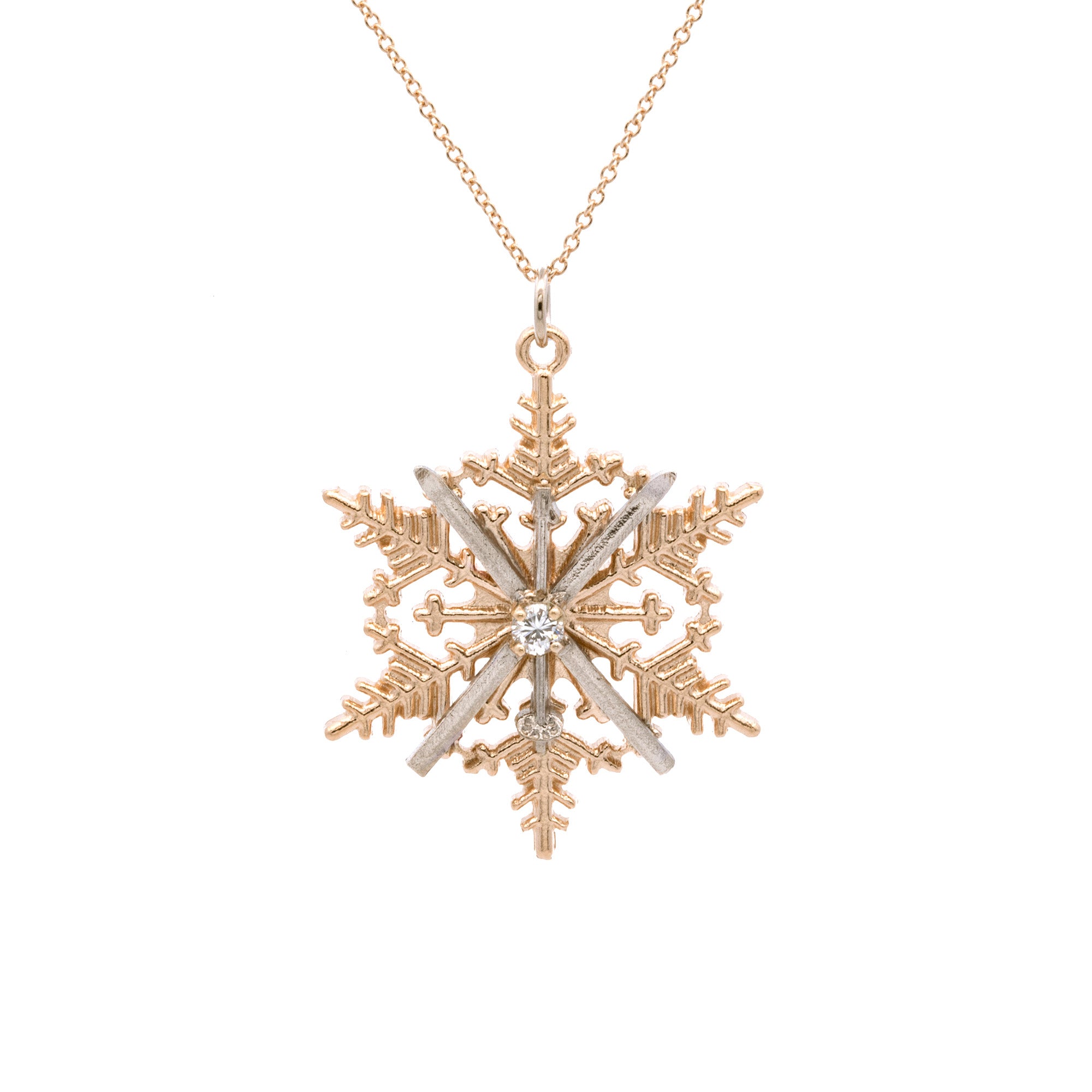 14K Yellow And White Gold Ski Museum Diamond Snowflake And Ski Pendant With 18 Inch Chain. The Diamond Weighs 0.10 Carats And Has G-H Color And VS Clarity.