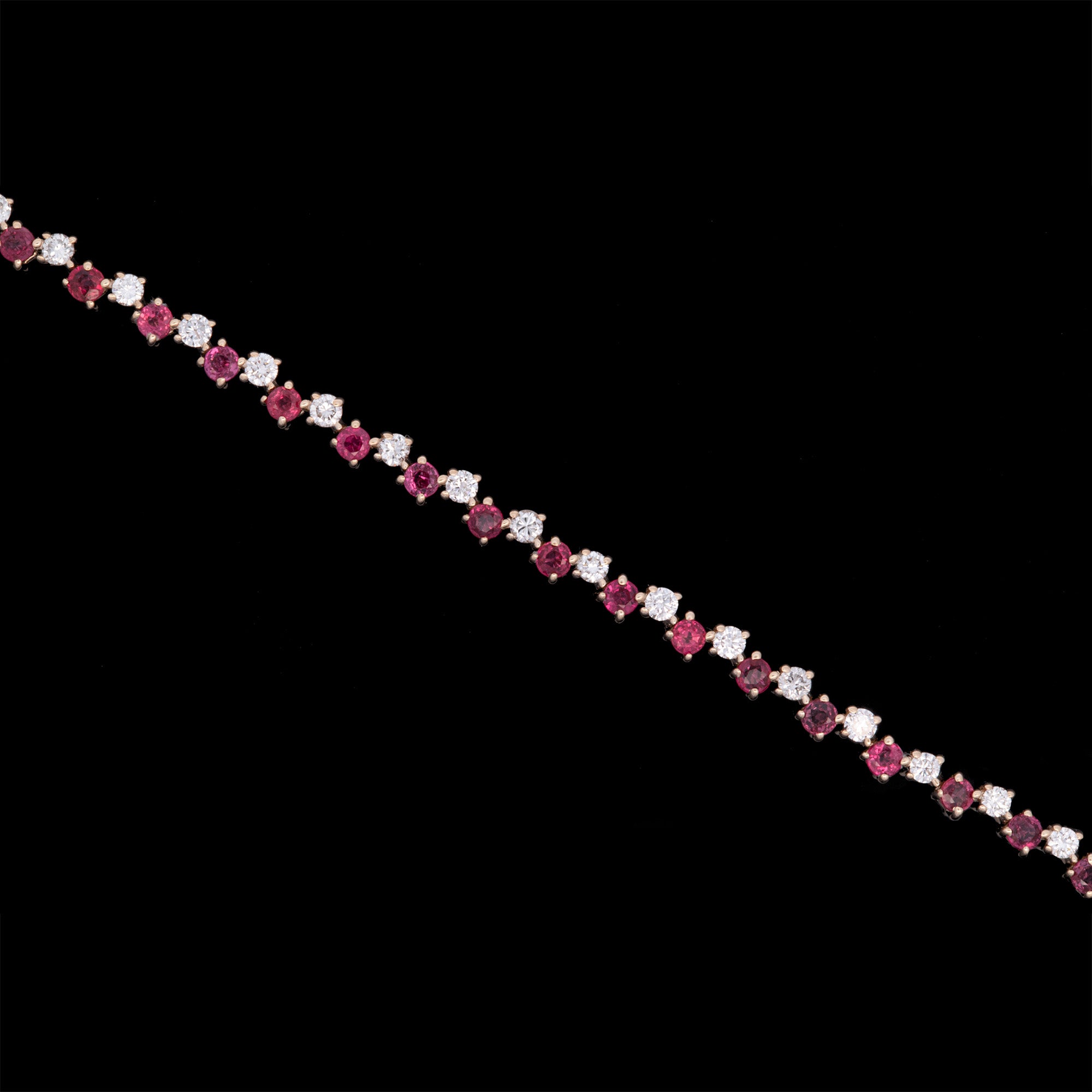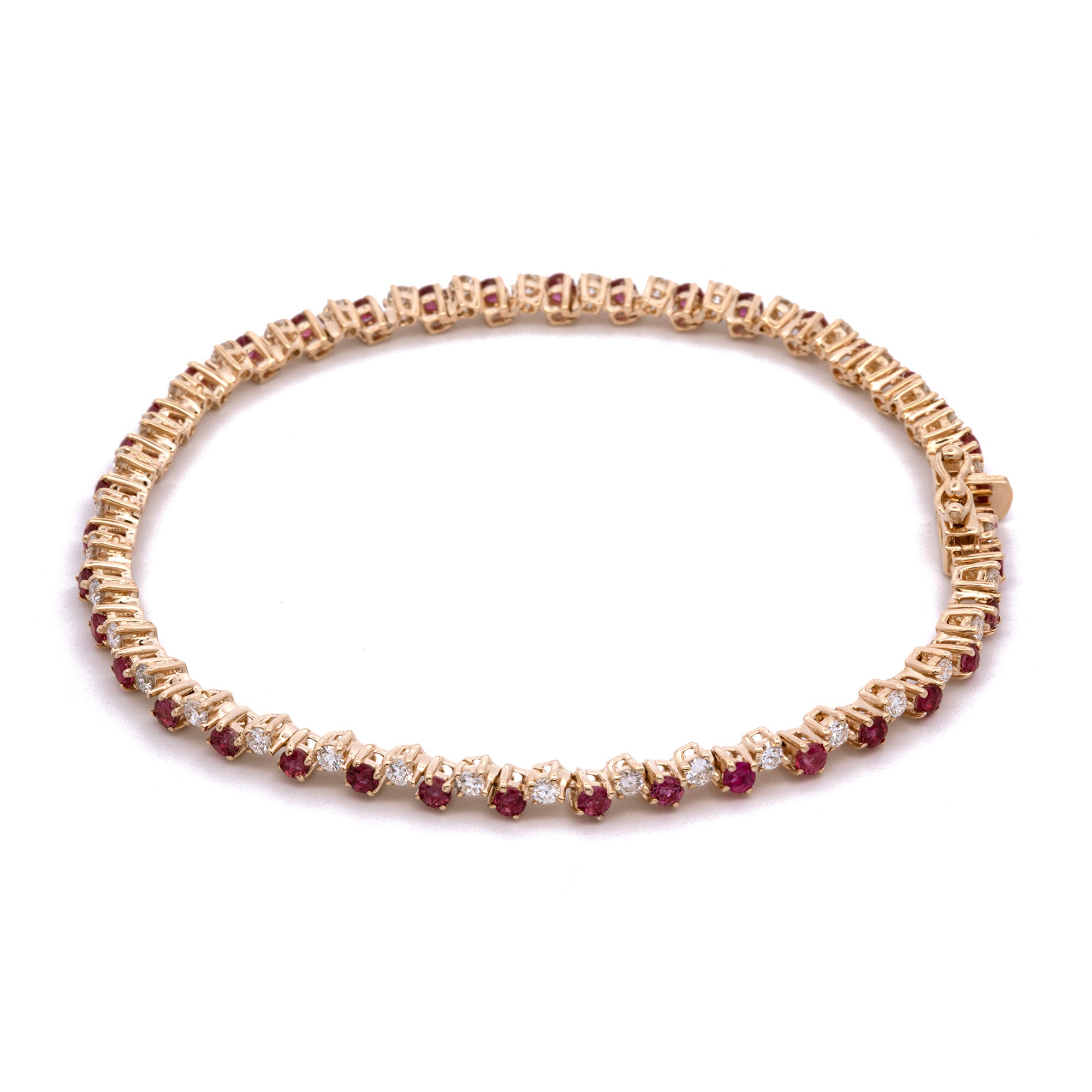 14K Yellow Gold Ruby And Diamond Bracelet, 7 Inches. Thirty-Seven Round Rubies Weigh A Total Of 2.60 Carats. Thirty-Seven Round Diamonds Weigh A Total Of 1.26 Carats.