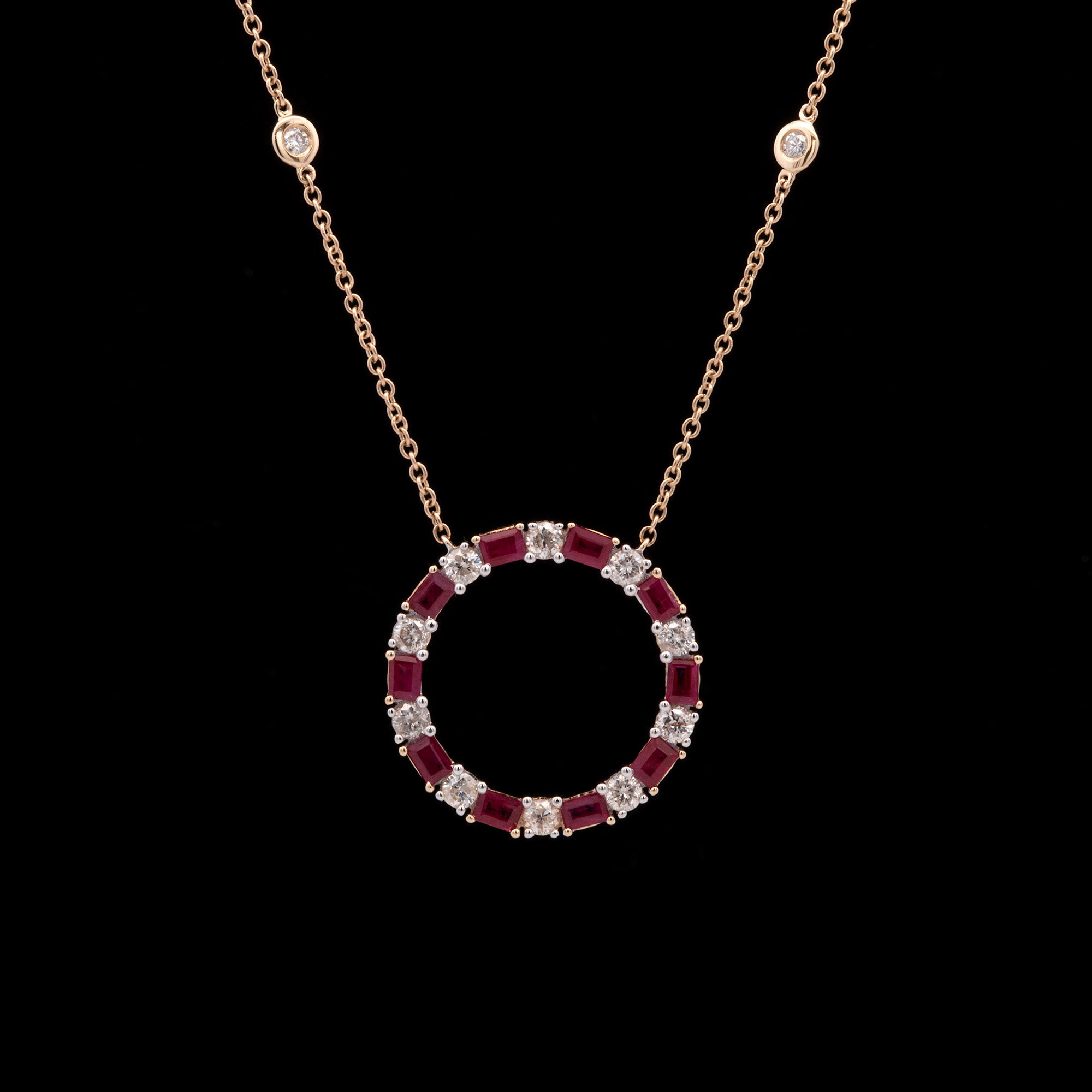 14K Yellow Gold Ruby And Diamond Circle Necklace With 18 Inch Chain