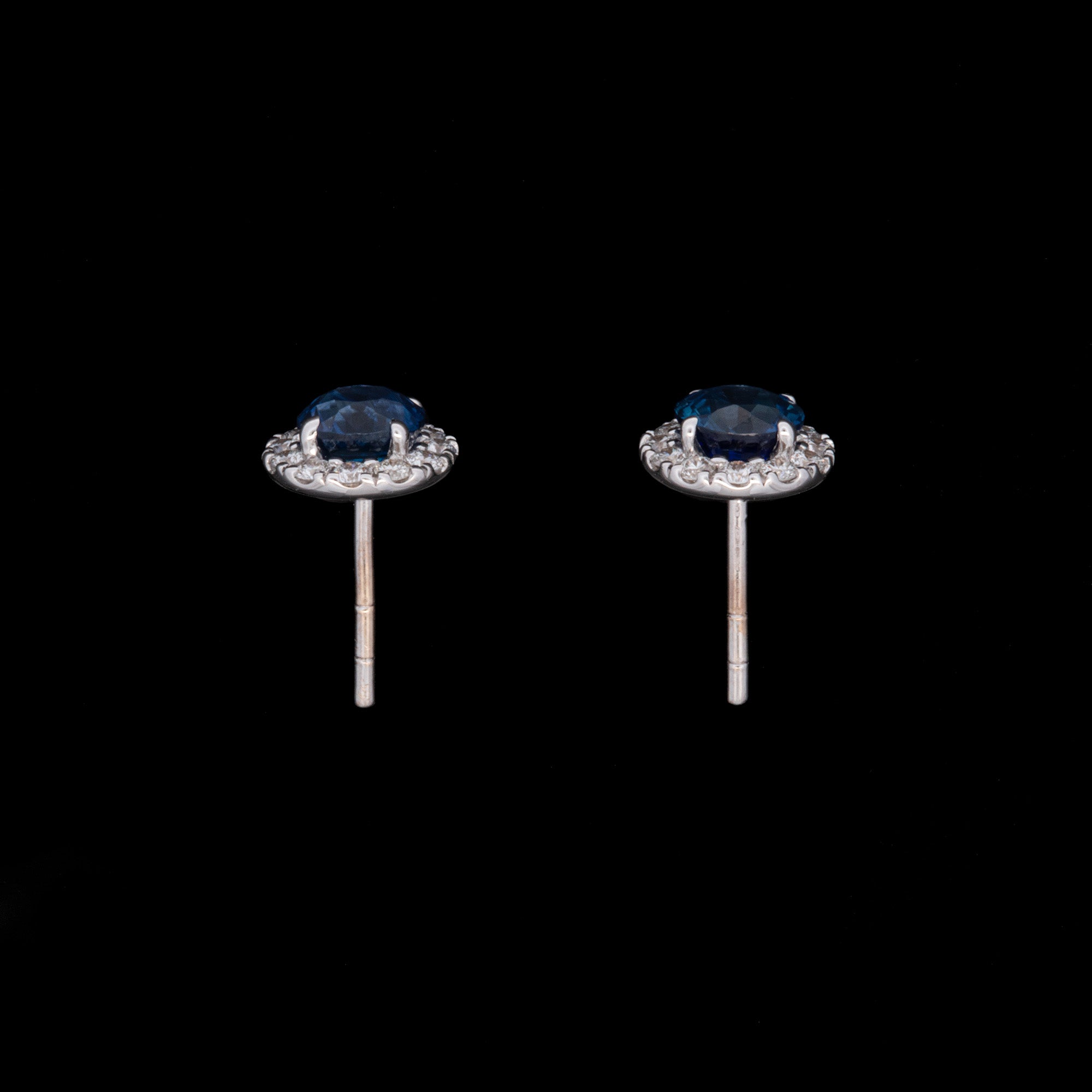 18K White Gold 1.78ctw Sapphire And Diamond Halo Stud Earrings. Two Sapphires Weigh A Total Of 1.78 Carats. Twenty-Four Round Brilliant Cut Diamonds Weigh A Total Of 0.41 Carats And Have G-H Color, VS2-SI1 Clarity.