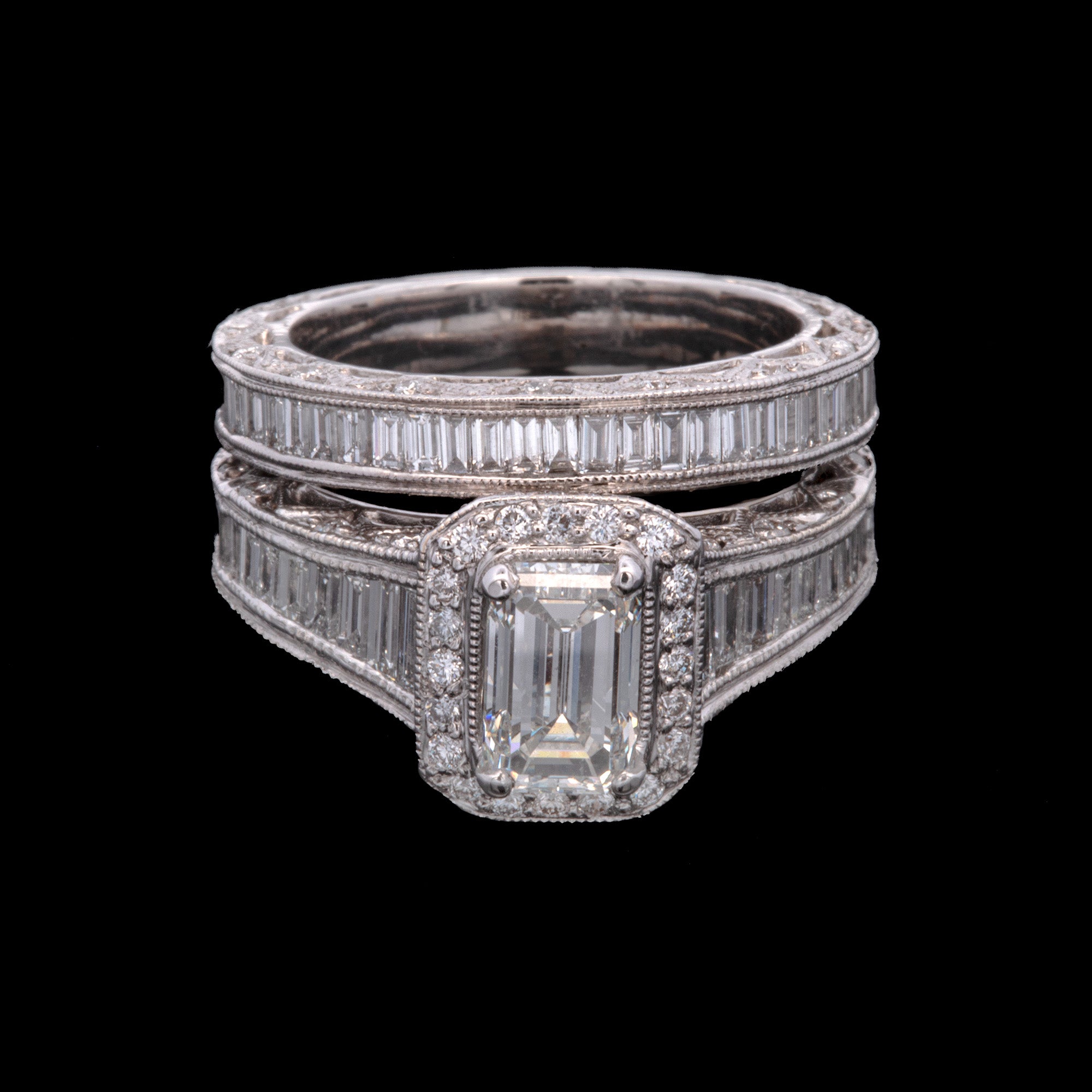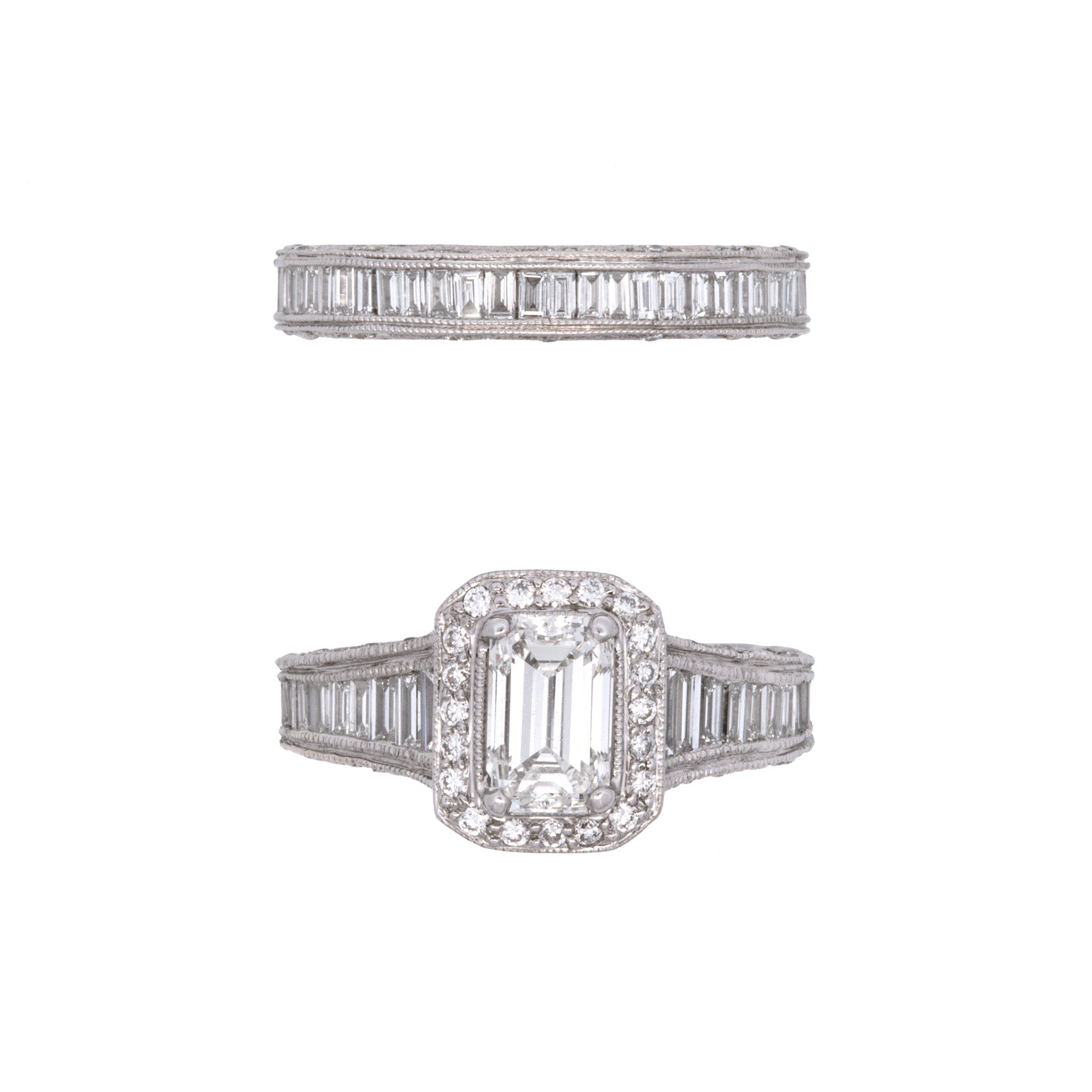18K White Gold Emerald Cut Diamond Ring And Wedding Band Set.