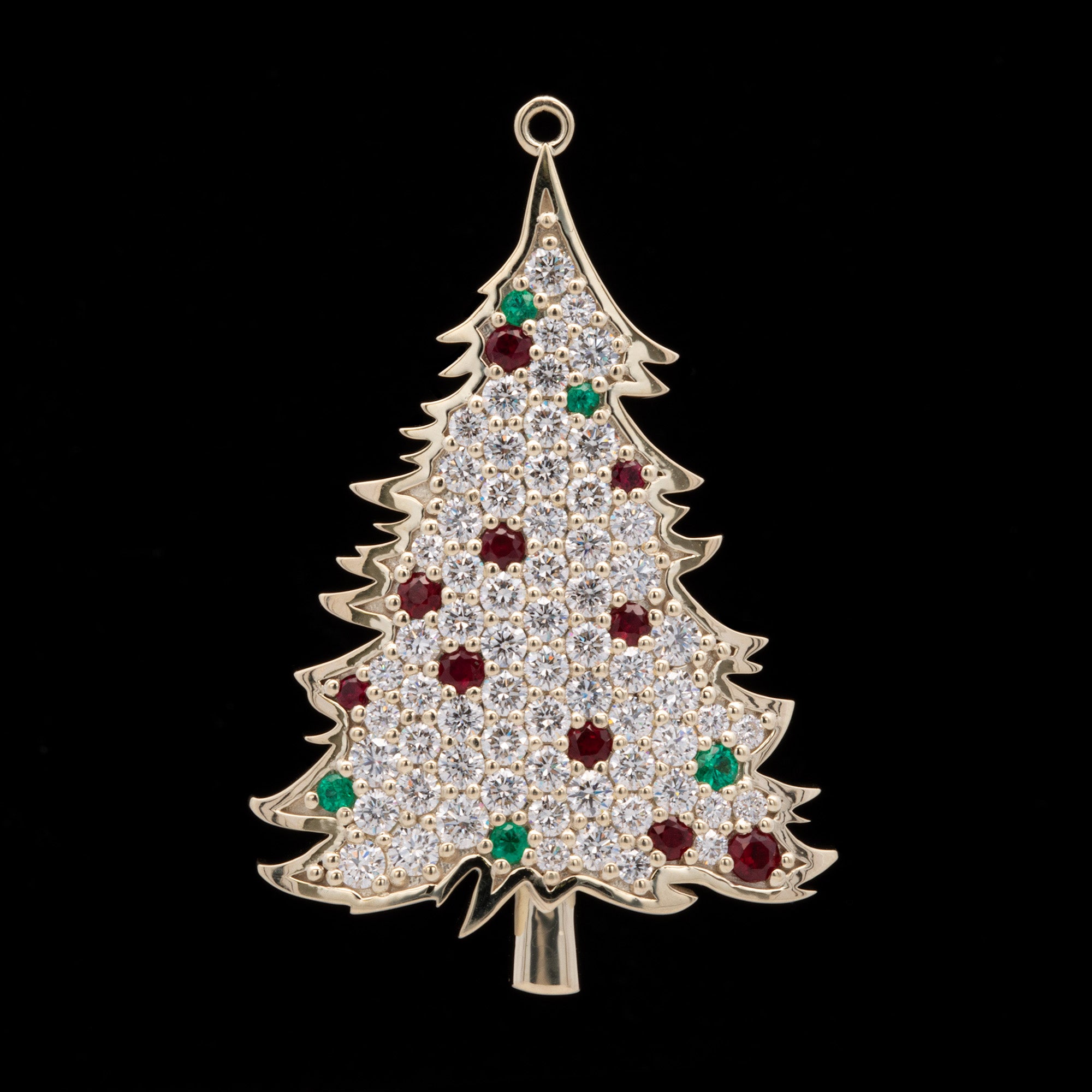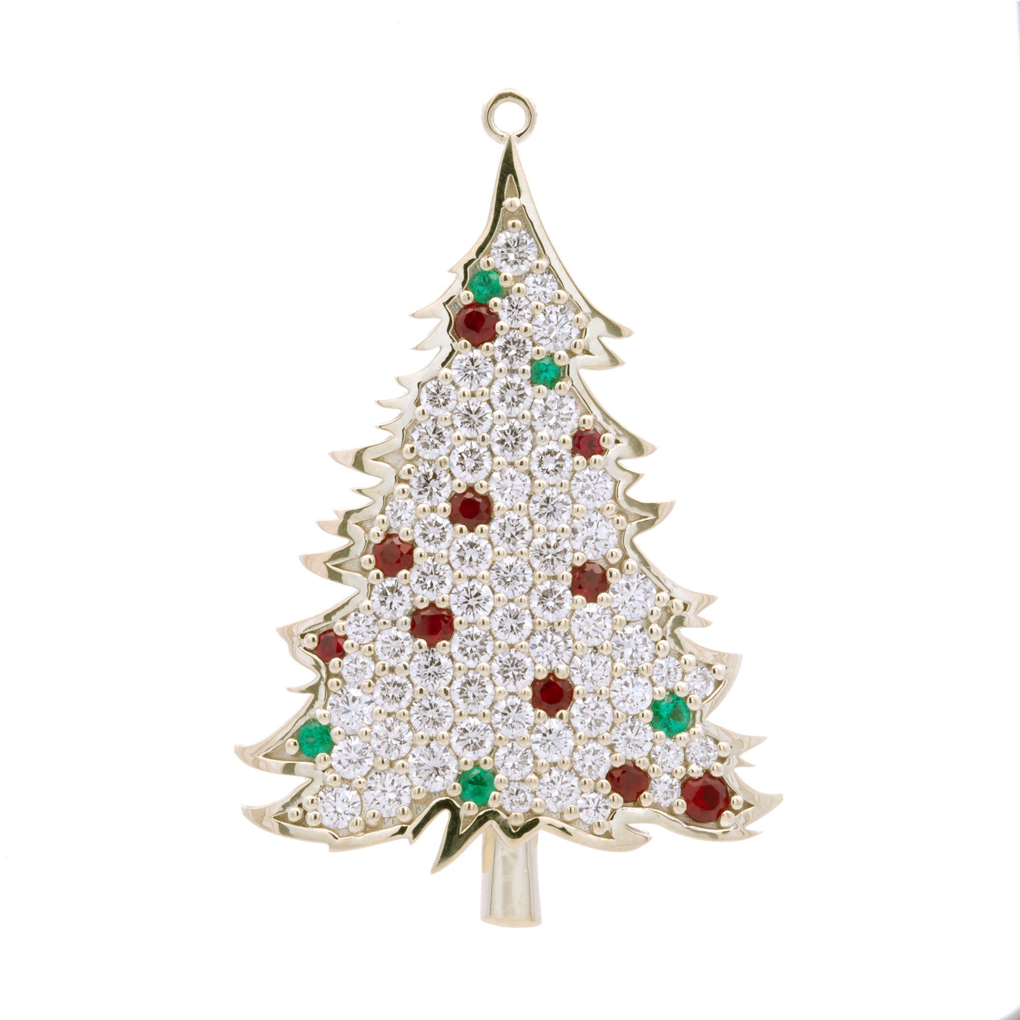 Custom 14K Green Gold Christmas Tree Pendant With Diamond, Rubies, And Emeralds. Pendant Measures 50mm. Stones Weigh A Total Of 5.56 Carats.