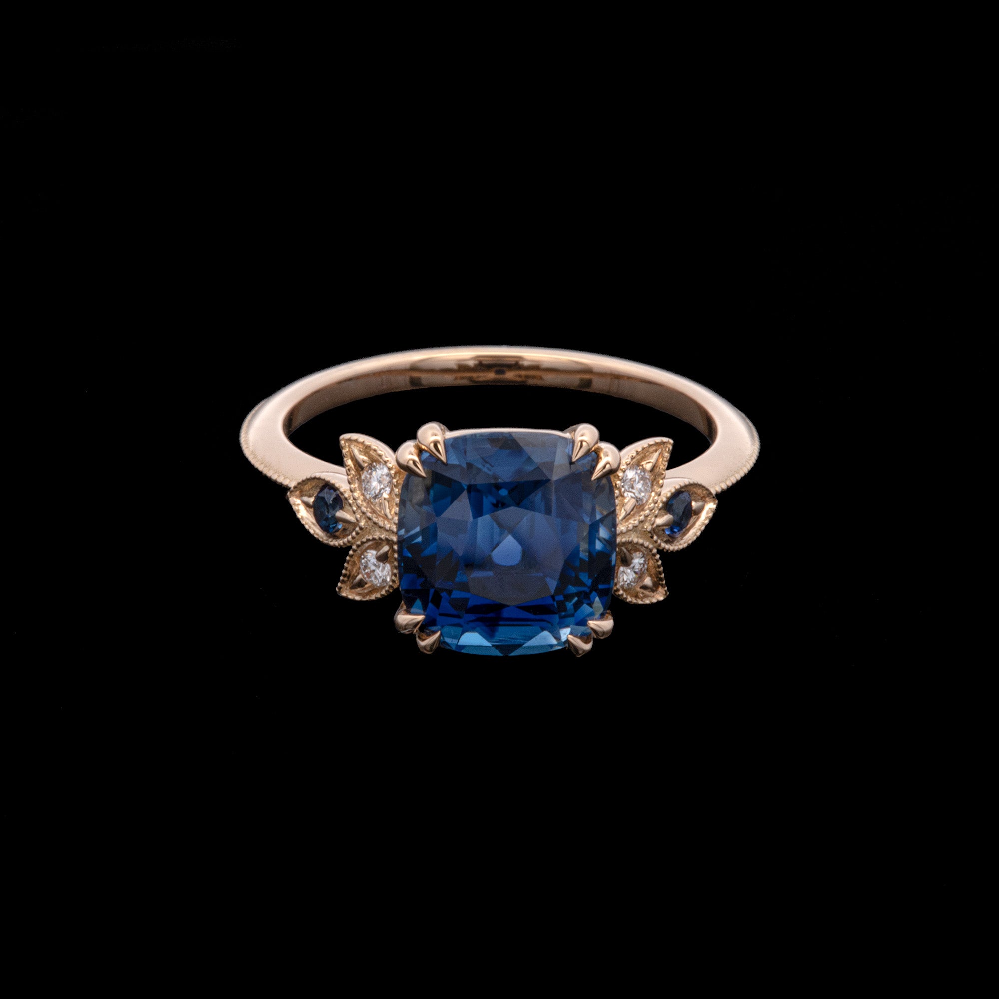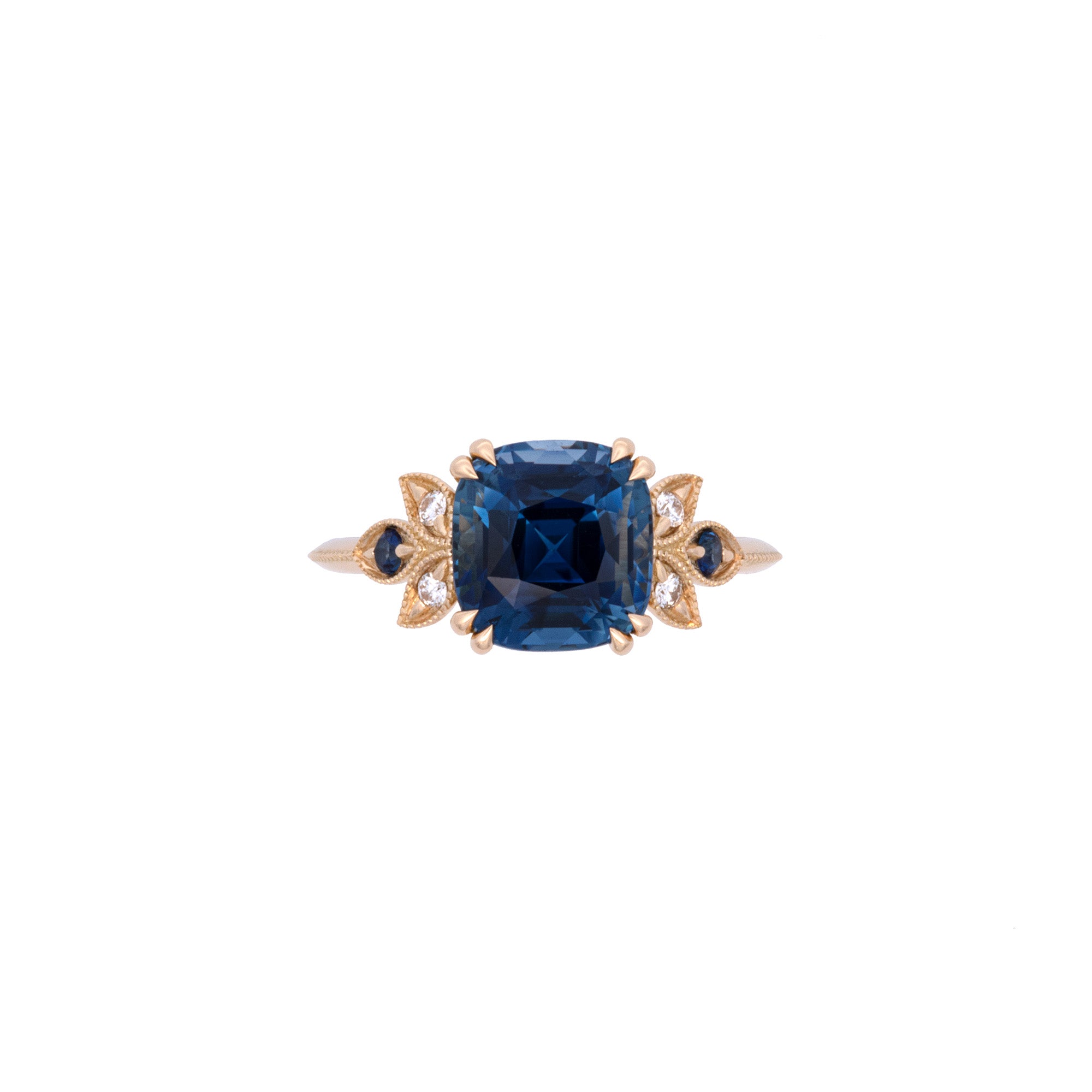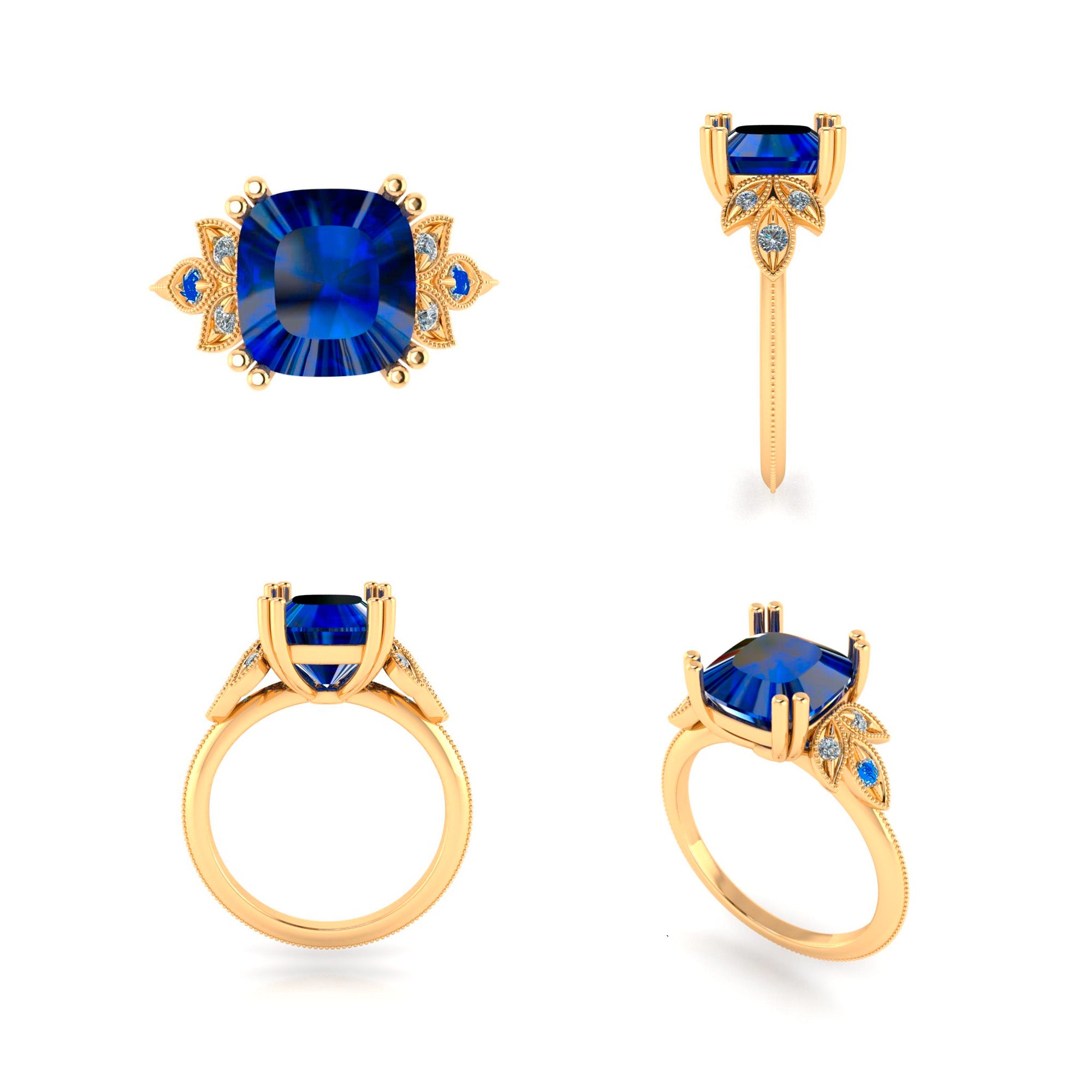 Custom 18K Yellow Gold Cushion Cut "No Heat" Sapphire Ring With Diamond Accents